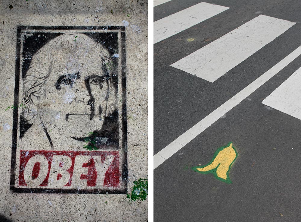 Natour is particularly interested in stencils and has even made a few herself. She says stencils are often political, like one featuring Thomas Jefferson and the word "OBEY" that has appeared in a few spots around Grounds this year. She overhears students pondering its meaning whenever they walk by. "It’s really clever," she says, and it could be about so many different things here at UVA.