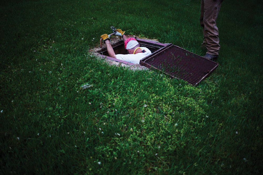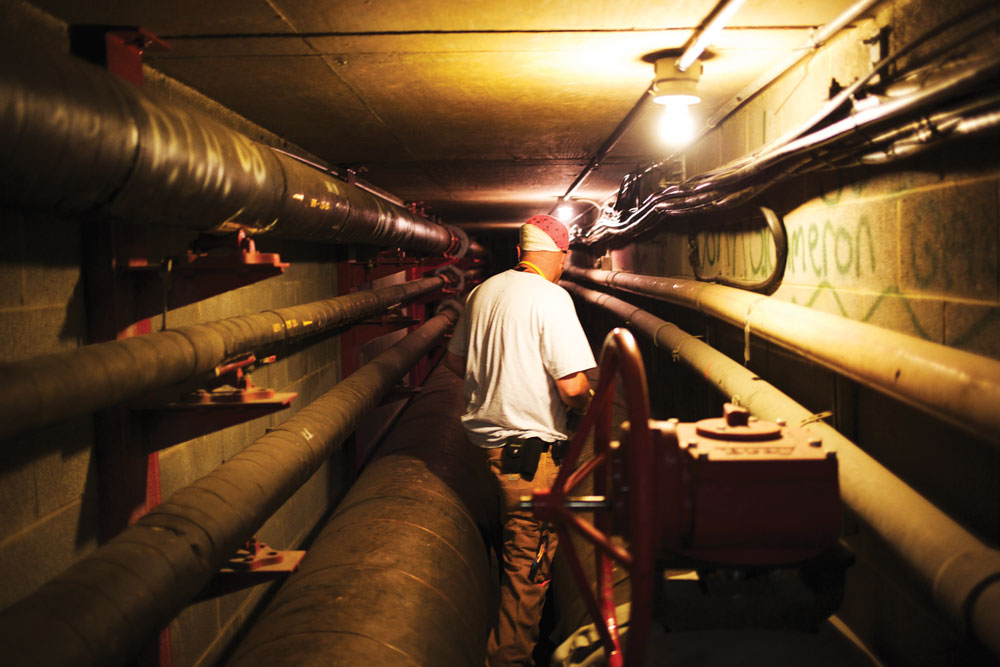 Once a year in the late spring, Roach’s crew, along with nearly 50 contractors and workers in the University’s heating plant, shut down the entire system so that they can perform large-scale maintenance and repairs in the tunnels, such as replacing pipe sections and removing asbestos insulation.