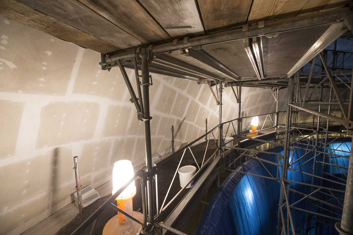 During the roof and oculus replacement, the building’s interior was vulnerable to weather conditions. Inside the Dome Room, 48-foot-high scaffolding gave workers access to the oculus (the skylight) and helped support a synthetic rubber “bathtub” that captured any intruding water and debris, which was pumped away without damage to the building’s interior.