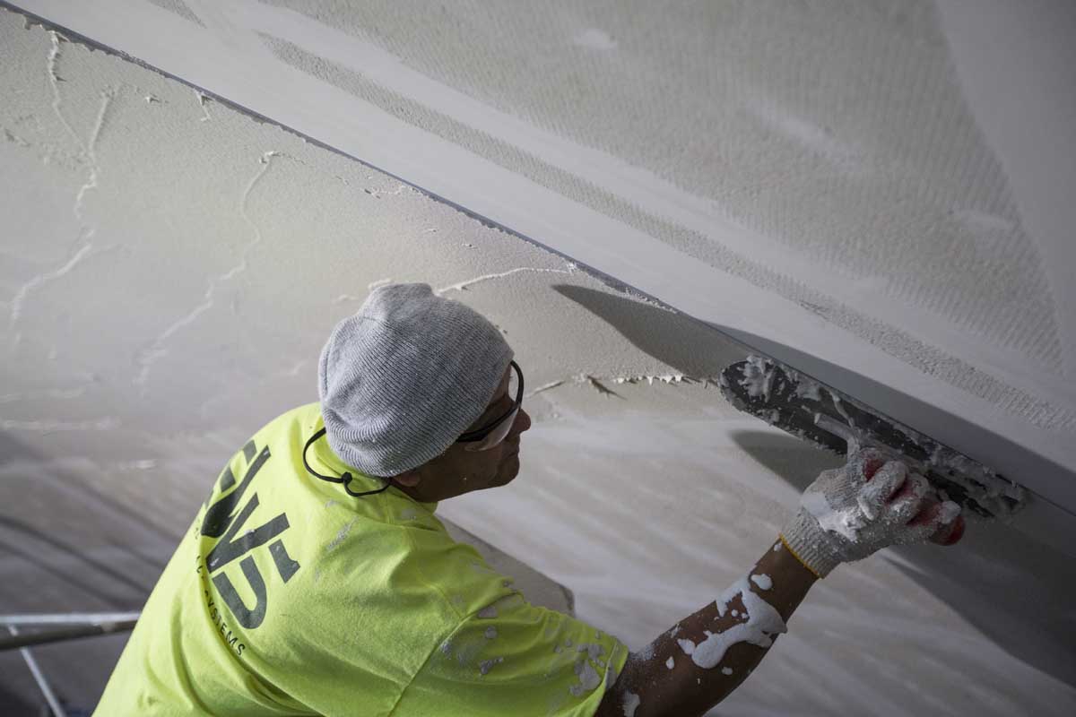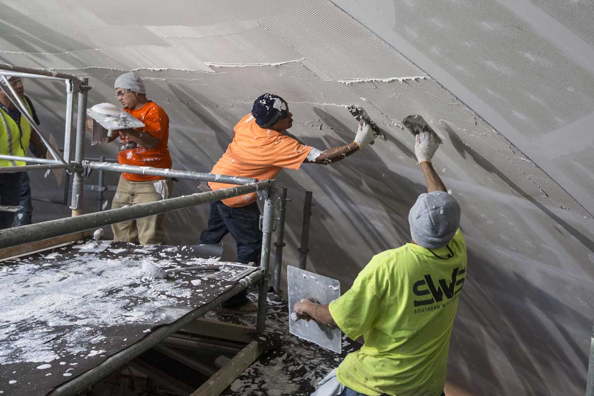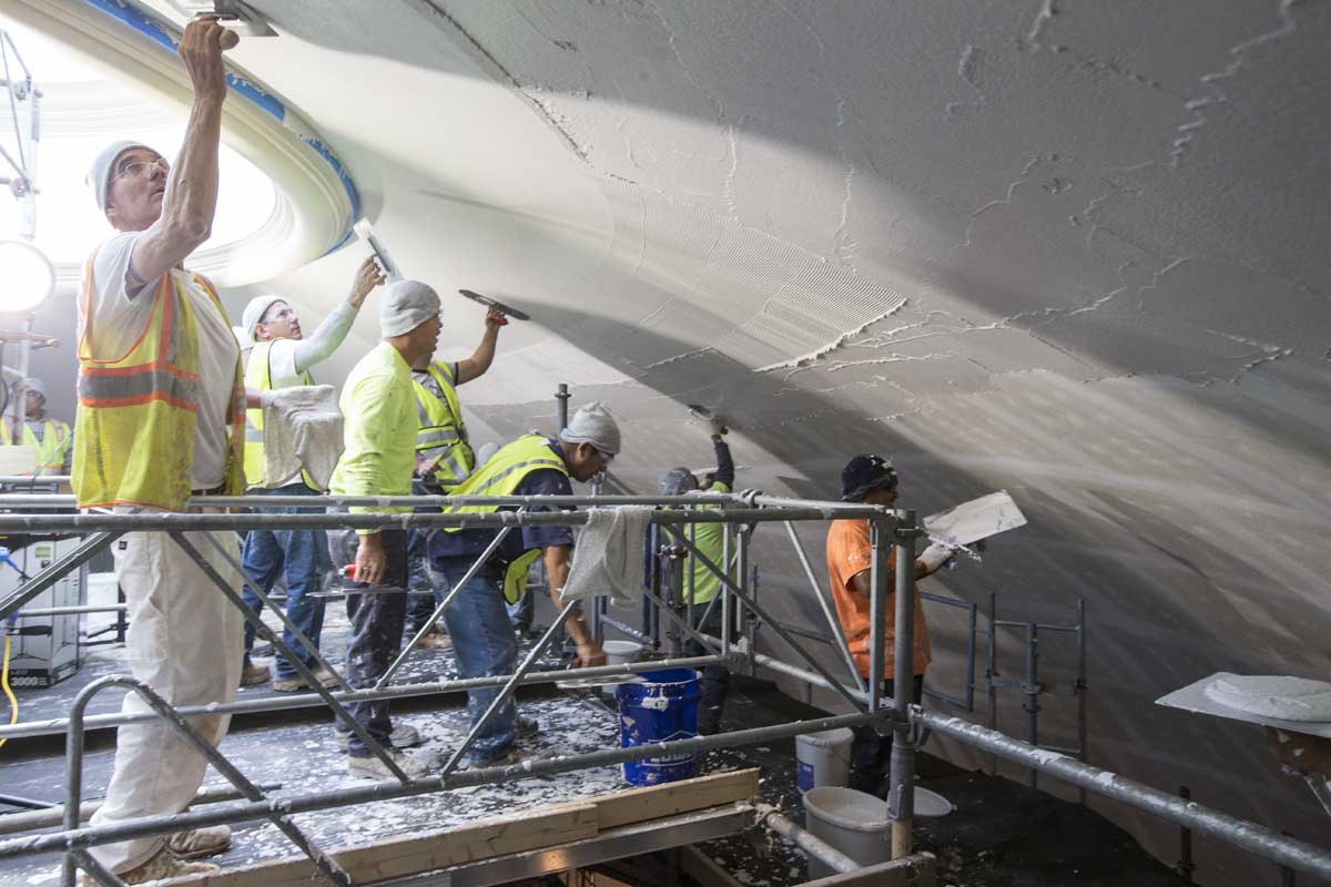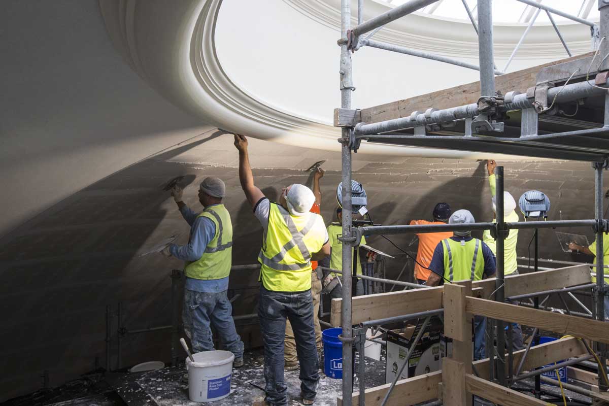 Workers first cut rectangular pieces of porous backing board to fit around the curved surface of the dome ceiling. Metal channels hold the backer board a few inches off the terra-cotta dome, giving some air space between the plaster and the structural dome. Then, workers painstakingly applied a perforated, acoustical plaster to the backer board and covered the plaster with a very thin finish to achieve a smooth, rounded look.