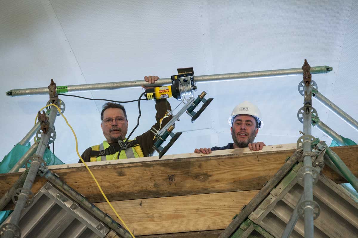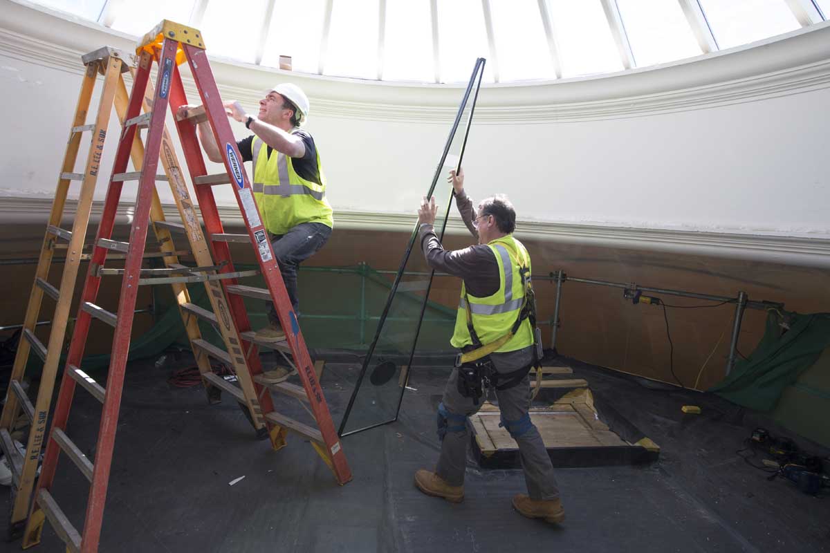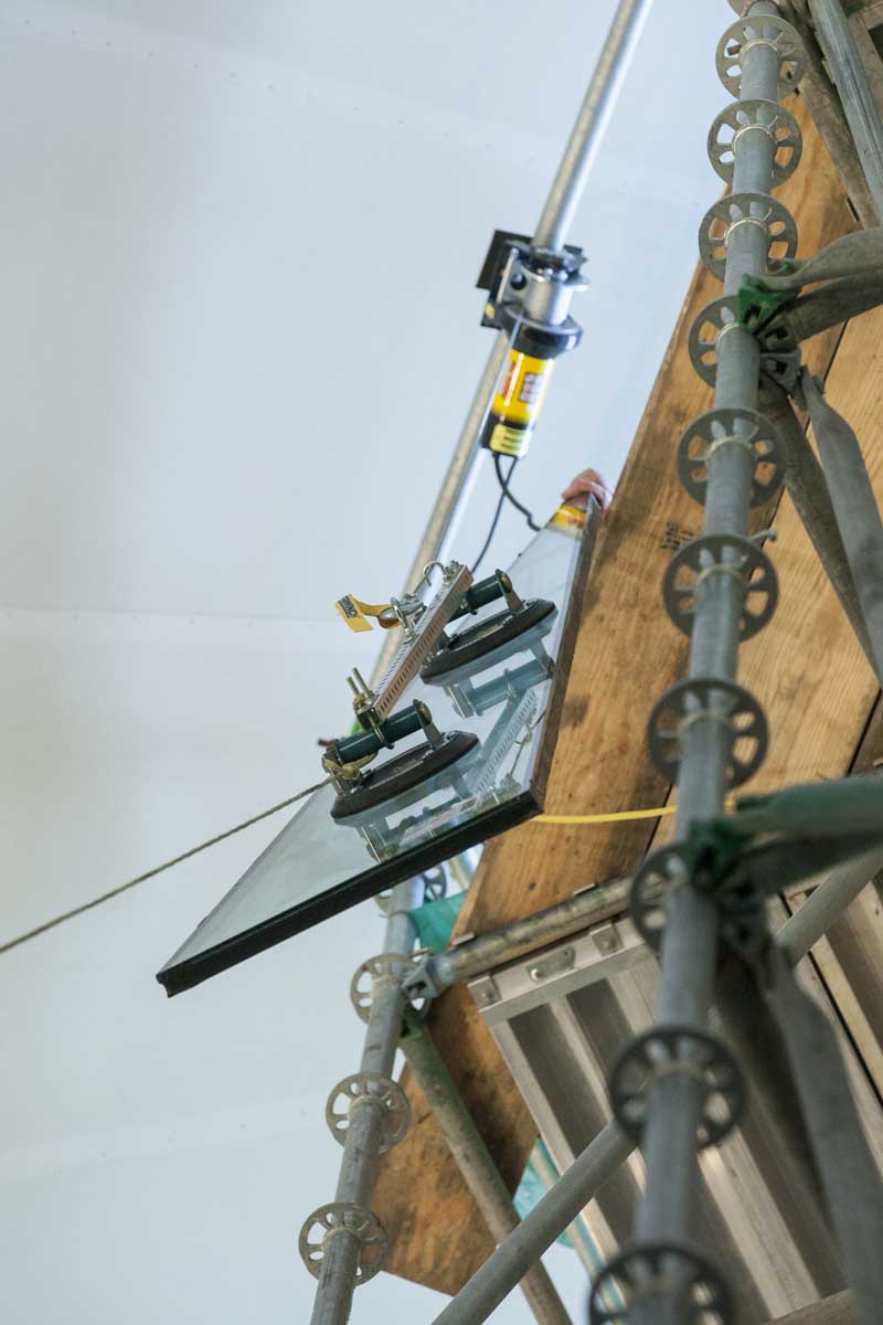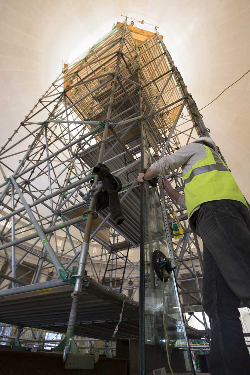 Hoisting more than two tons of glass to the top of the dome posed a significant challenge: working together, two installers bolted a winch to the scaffolding and secured suction cups to the glass to carefully raise each 127-pound pane to the oculus.