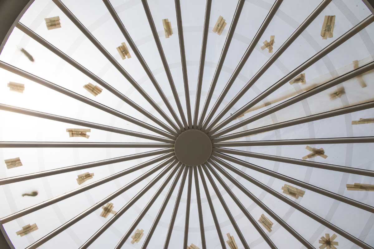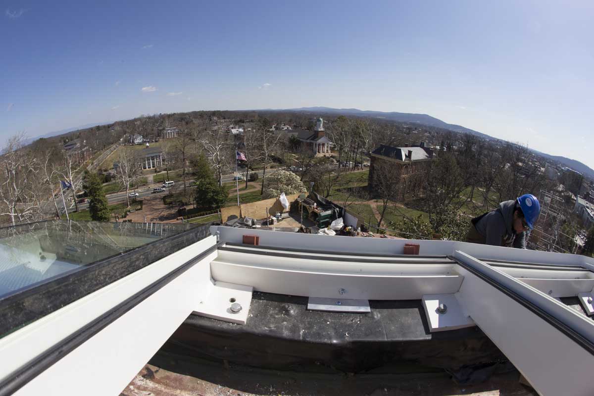 The etchings on the glass are representative of Jefferson’s original oculus, which was made with smaller, overlapping glass shingles because the technology did not yet exist to make the large panes that are used today. The approximately 2.5-inch overlap of the glass shingles is represented by a silk-screened pattern on an interior layer of the insulated glass.