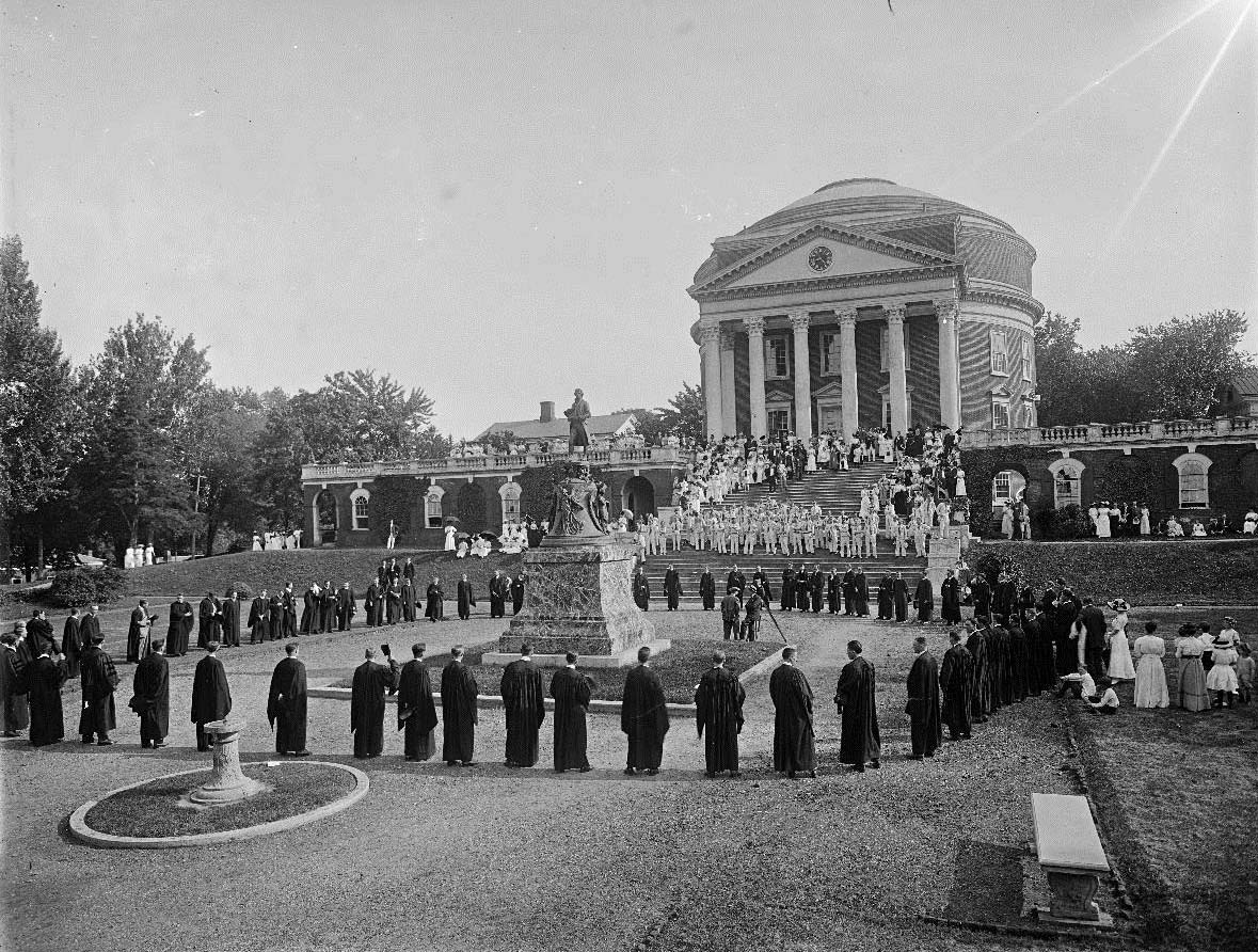 After the 1910 commencement exercises in Old Cabell Hall, graduates and guests gathered to witness the dedication and unveiling of a statue of Thomas Jefferson by the artist Moses Ezekiel. The statue was installed in the landscaped plaza on the north side of the Rotunda. Ezekiel also created “The Homer Group” or Homer and His Guide, which was unveiled on the Lawn on June 10, 1907.