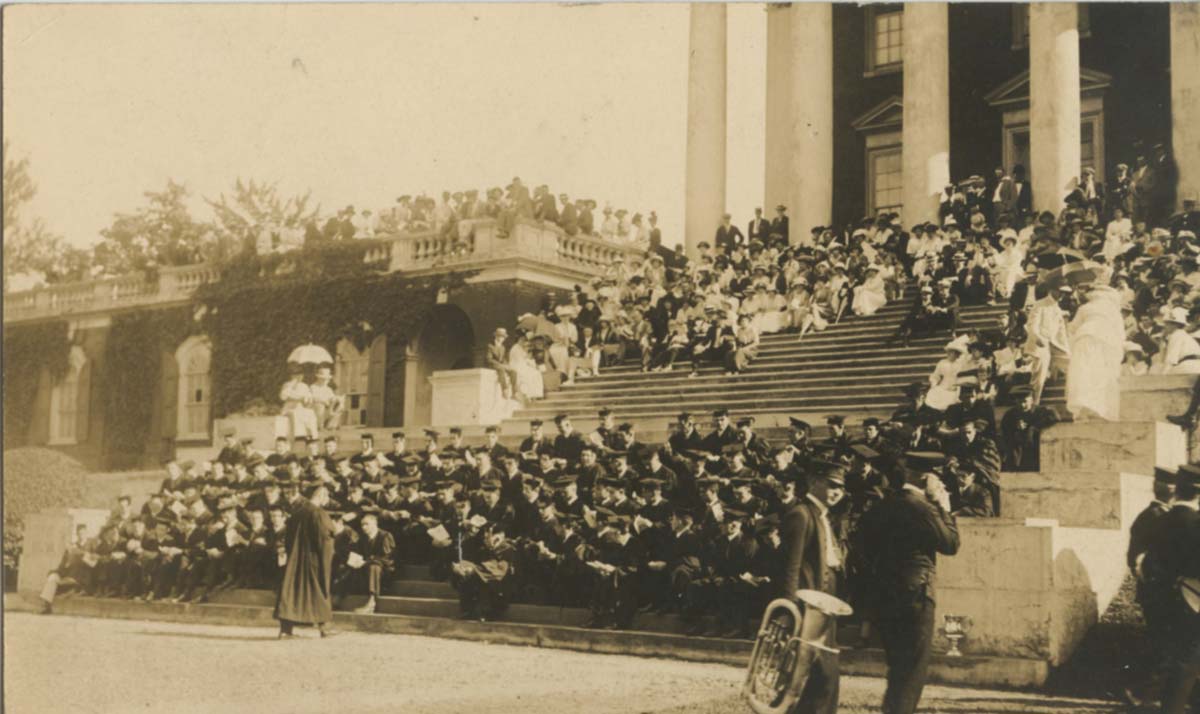 McIntire Amphitheatre during graduation and Final Exercises, with Cocke Hall in background. Centennial year.