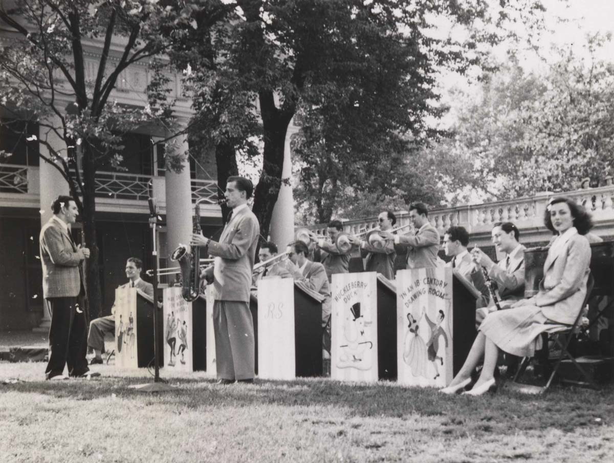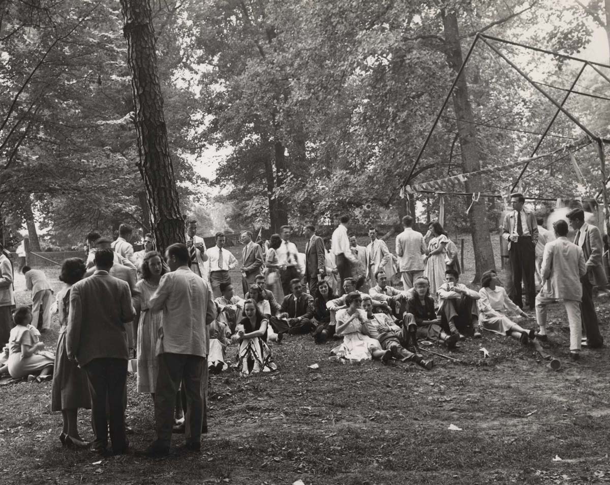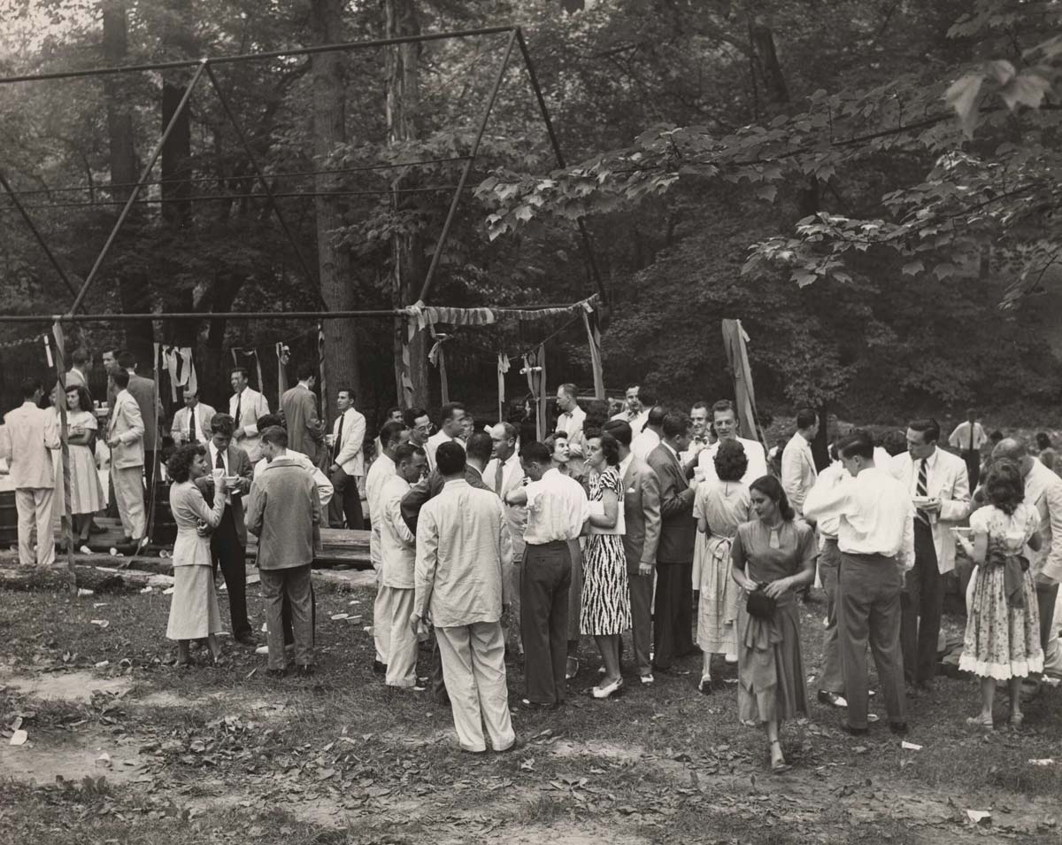 Graduation barbecue during Finals weekend. From excerpt on photo: “The barbecue of the graduating class of 1948—a traditional feature of the Final Celebration, as the June commencement period is called. Lamb and pork is barbecued all night over the pit in the right background. Brunswick stew and beer round out the feast.”
