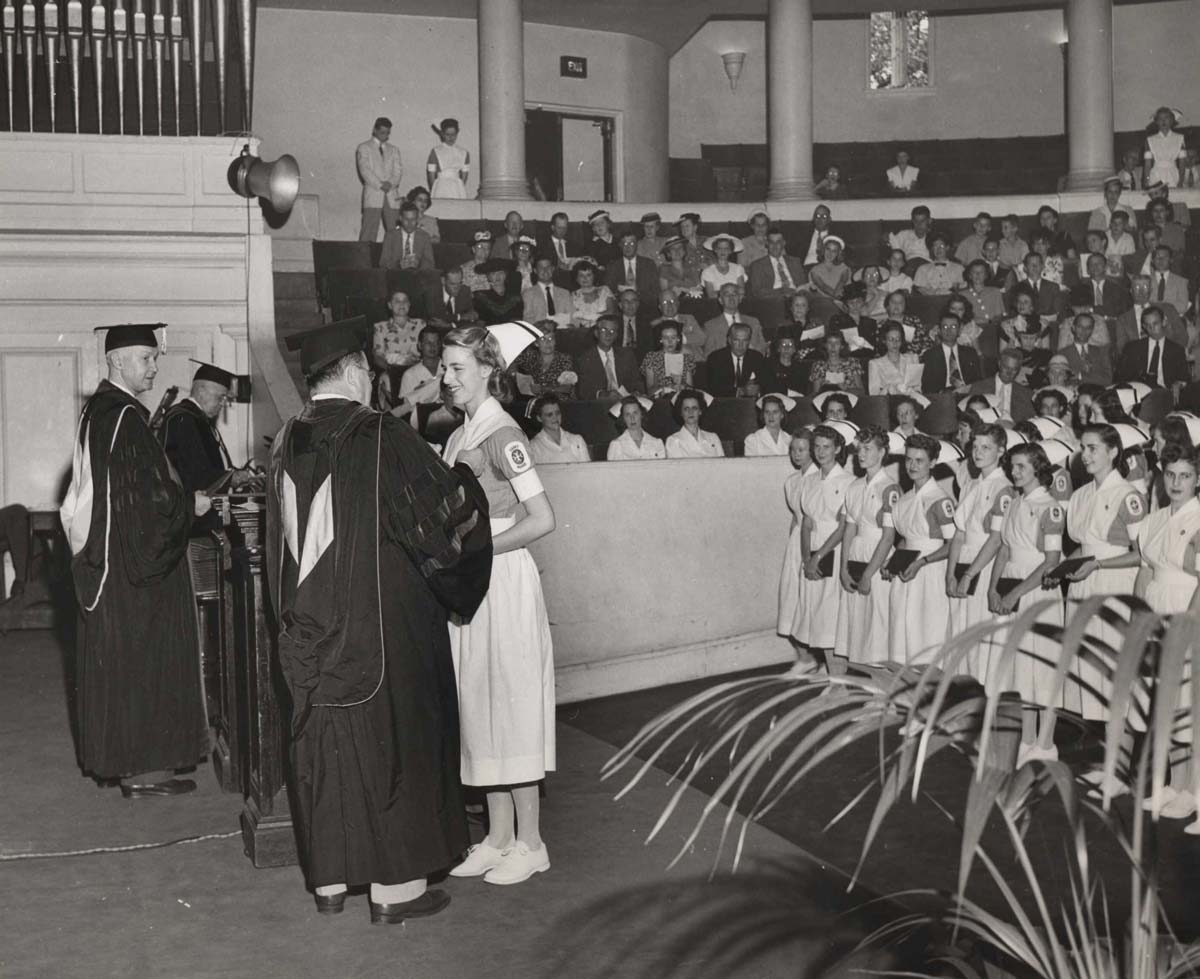 School of Nursing graduation and Final Exercises in Old Cabell Hall. From excerpt on photo: “University of Virginia—Graduation of the School of Nursing in Cabell Hall. The University of Virginia is co-educational only in its graduate and professional schools—with less than 200 coeds registered. The 350 student nurses are in much demand for social events.”