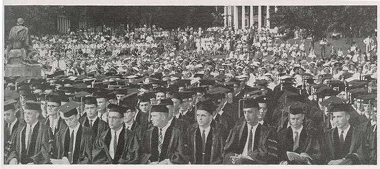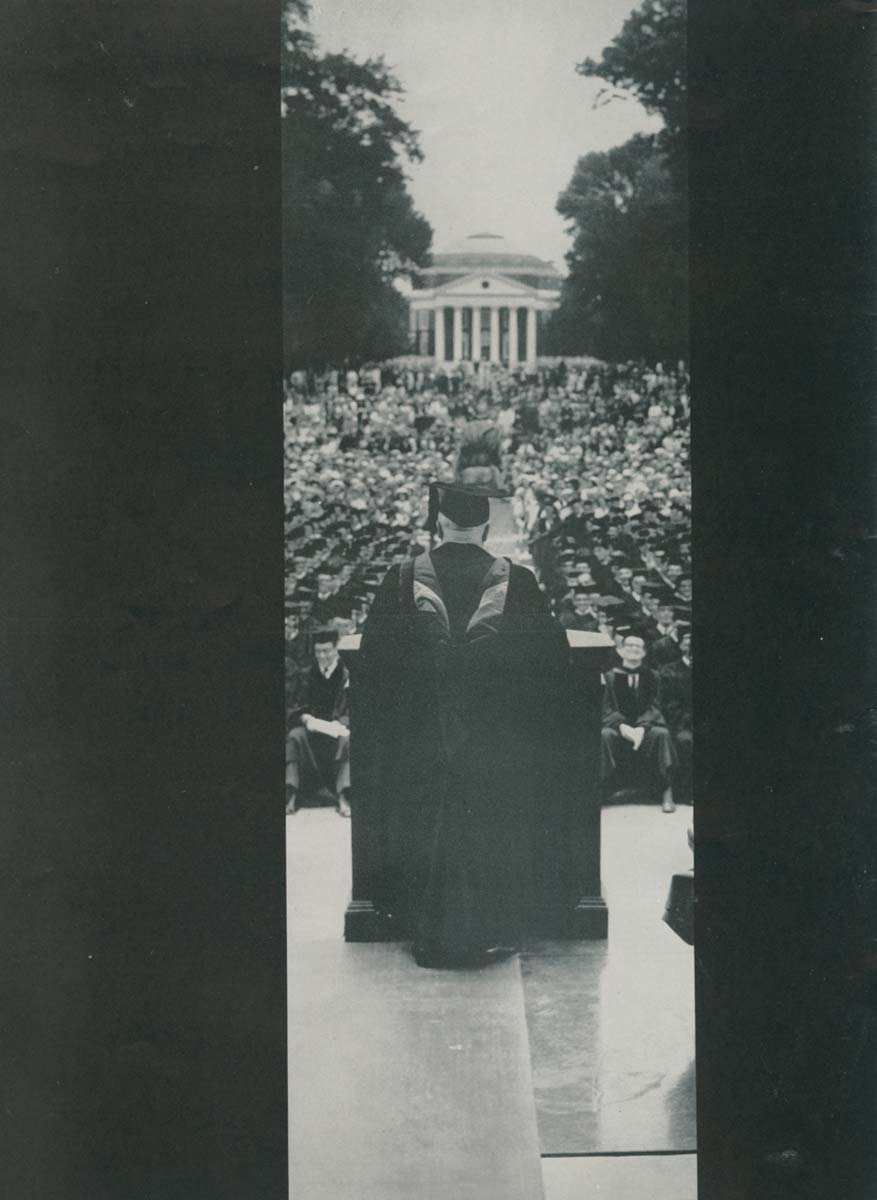 In 1958, 813 graduates received degrees. Finals speaker Francis Pendleton Gaines, president of Washington and Lee University, told the crowd, “America is in a sense of shock. It is because we have lost something we took for granted, something of utmost importance. We have lost the cult of our invincibility.”