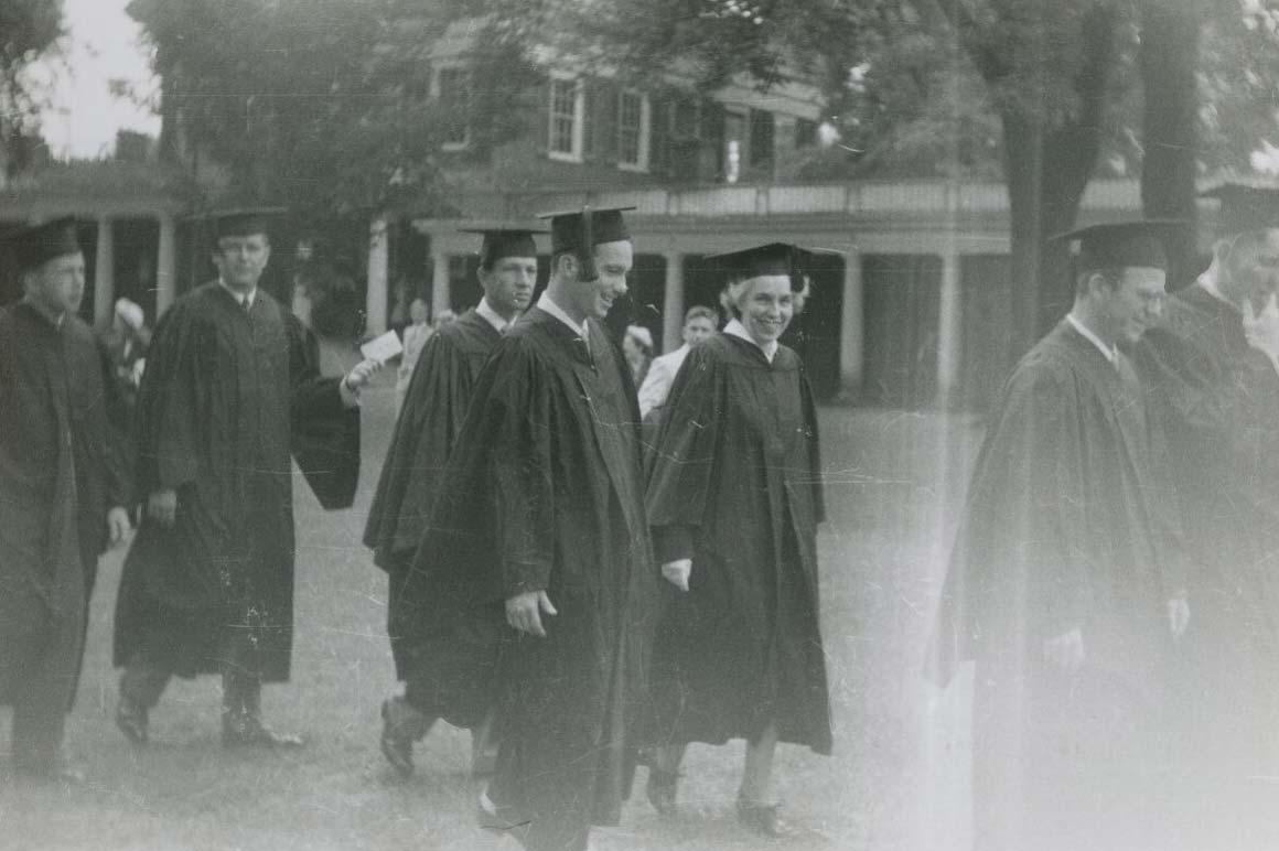 Catherine Russell (Grad class of ’51) processes onto Lawn with classmates for the graduation ceremony. She received her Ph.D. in microbiology.
