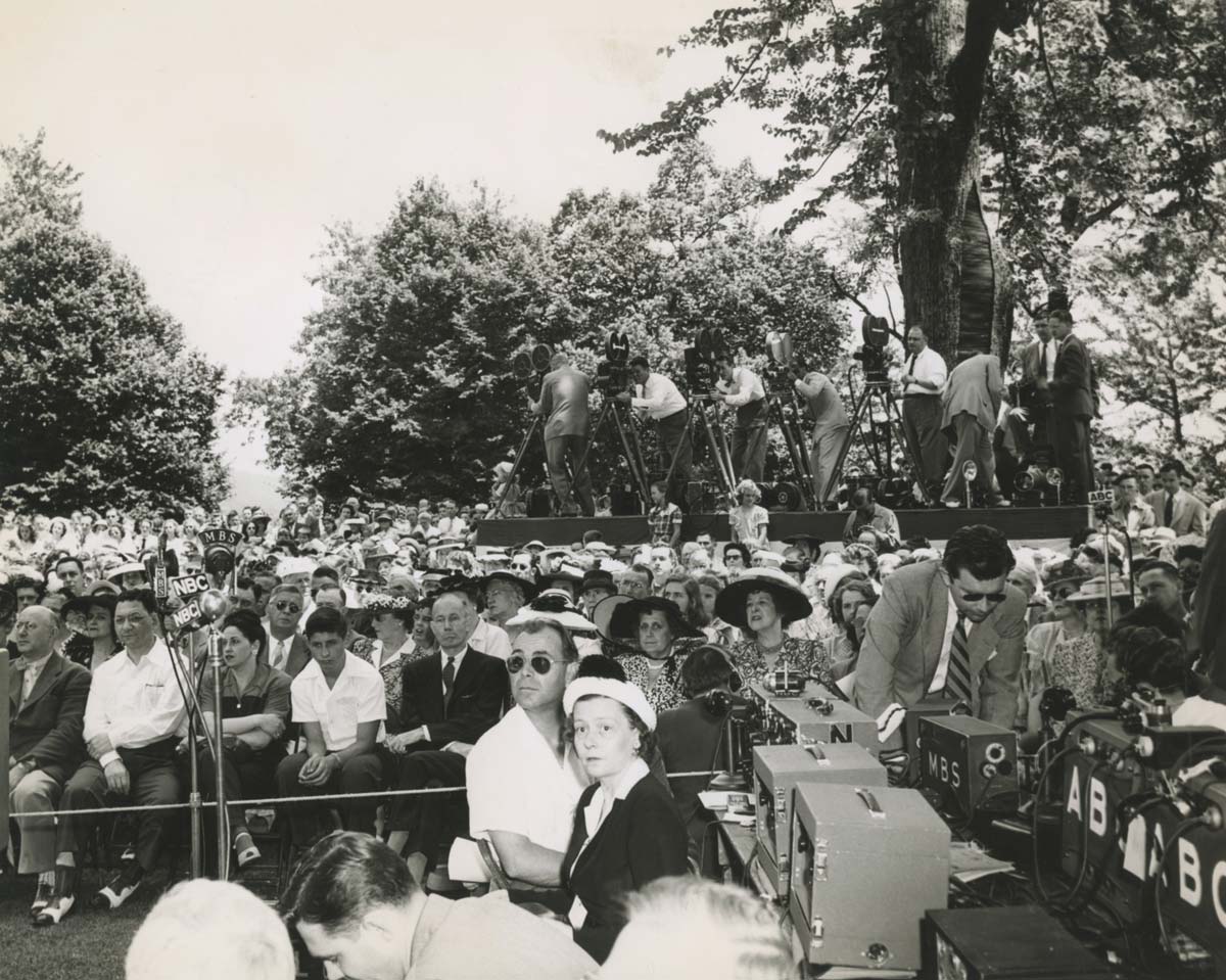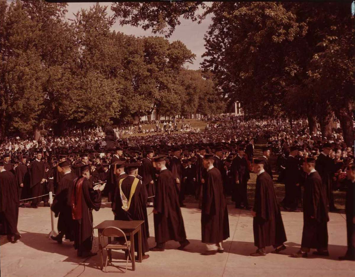 Spectators—and the media—on the Lawn for graduation. (ca. 1950s)
