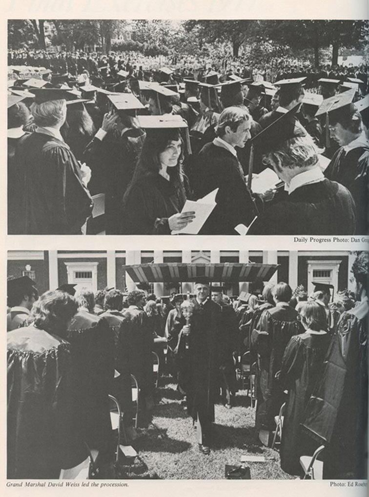 Former first lady Lady Bird Johnson gave the commencement speech in 1973, telling the crowd of 15,000, “Don’t despair of America.” Johnson also presented diplomas to Law School graduates (including to her son-in-law, Charles S. Robb [Law ’73]) in the third still above.