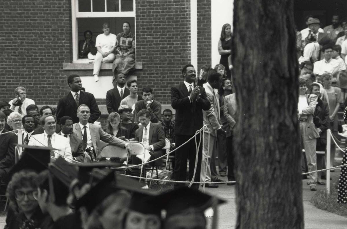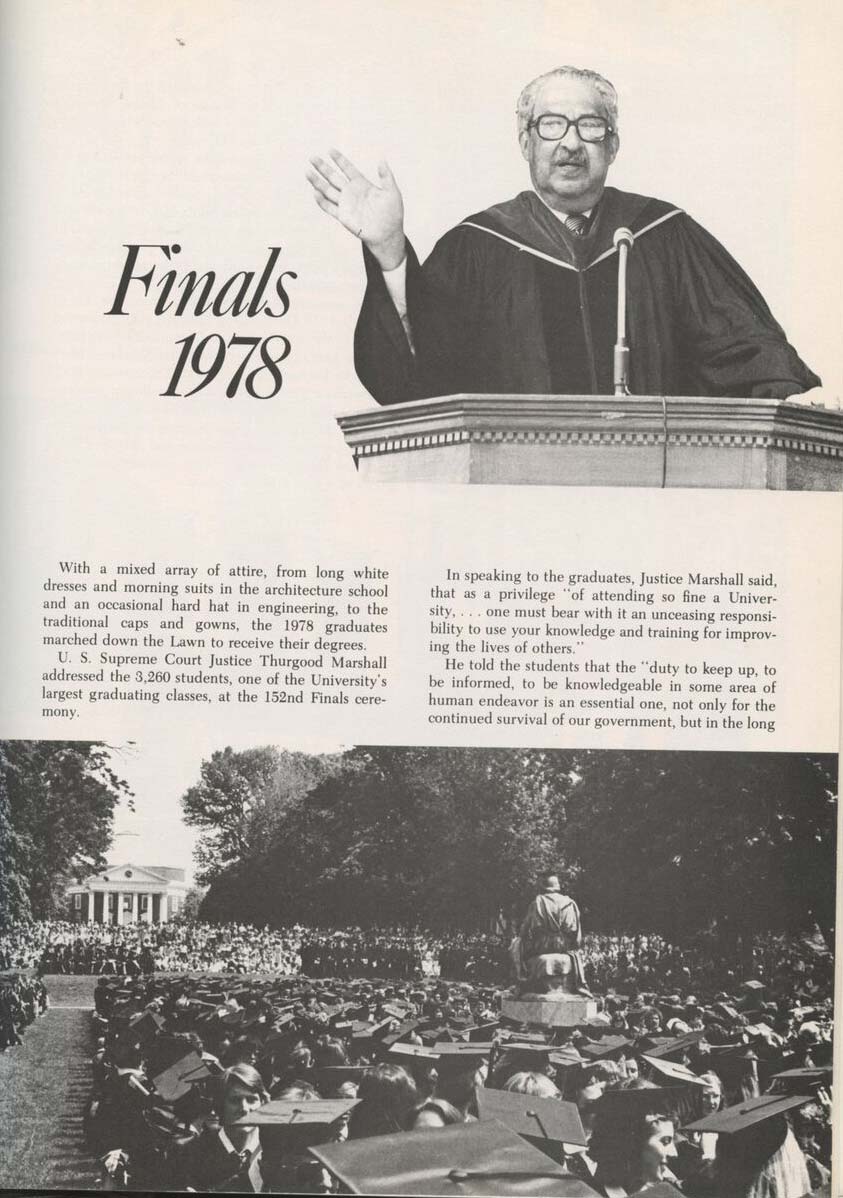 U.S. Supreme Court Justice Thurgood Marshall delivered the commencement address in 1978, telling the graduates, “It is hard work being well-informed, but it is essential work for the citizens of a democracy.”