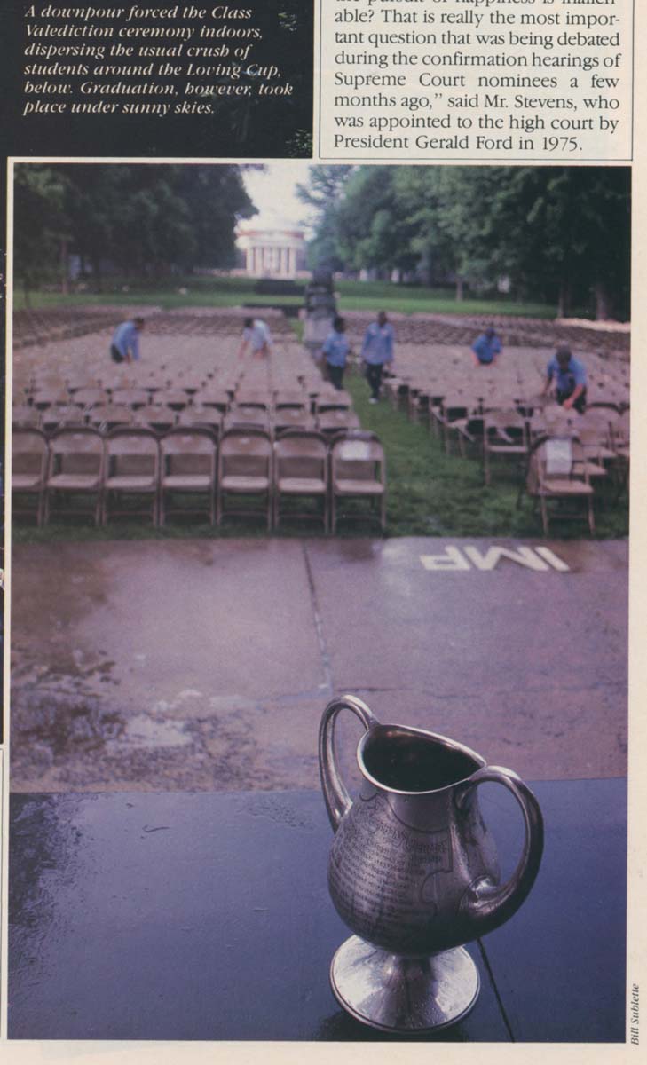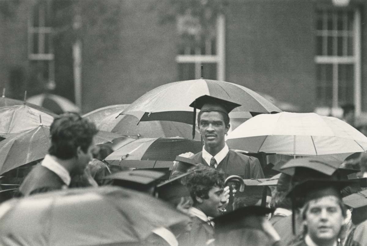 UVA basketball legend Ralph Sampson (Col class of ’83) towers above the crowd during a rainy 1983 graduation.