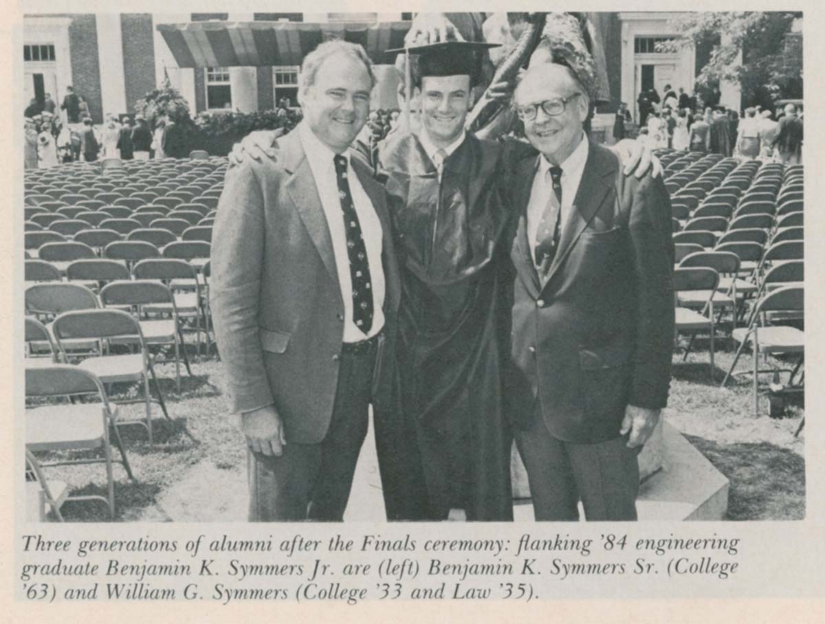 Three generations of alumni after the Finals ceremony: Benjamin K. Symmers Jr. (Engr class of ’84) with (left) Benjamin K. Symmers Sr. (Col class of ’63) and William G. Symmers (Col class of ’33, Law class of ’35).