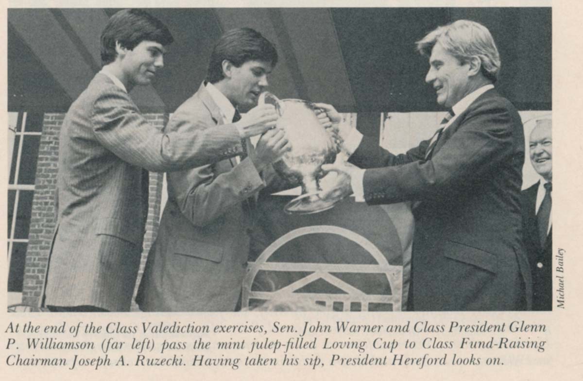 At the end of the valediction ceremony, Sen. John Warner (Law class of ’53)and class president Glenn P. Williamson (Col class of ’85) (far left) pass the mint julep-filled loving cup to class fundraising chairman Joseph A. Ruzecki (Col class of ’85). University President Hereford, having taken his sip, looks on.
