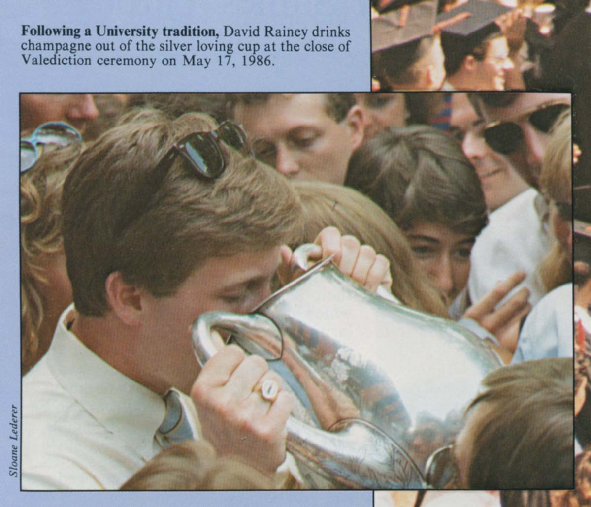 David Rainey (Com class of ’86) drinks champagne from the loving cup at the 1986 valediction ceremony.