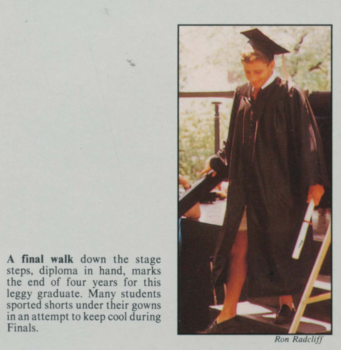 Many graduating students favor shorts under gowns to keep cool during the ceremony.