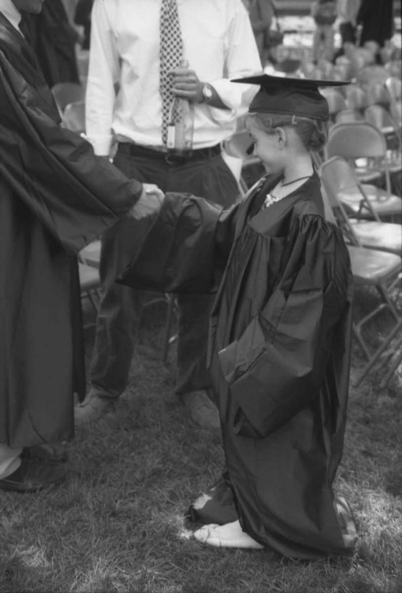 A little girl wears the cap and gown of a graduate during graduation and Final Exercises.