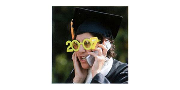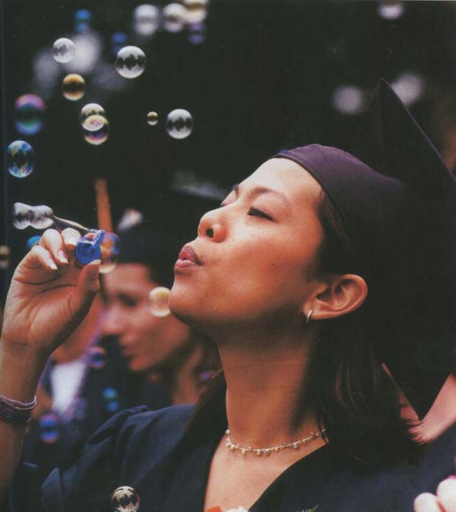 Michelle Le (Col class of ’99, Grad class of ’01) blows bubbles in celebration of her graduate degree.