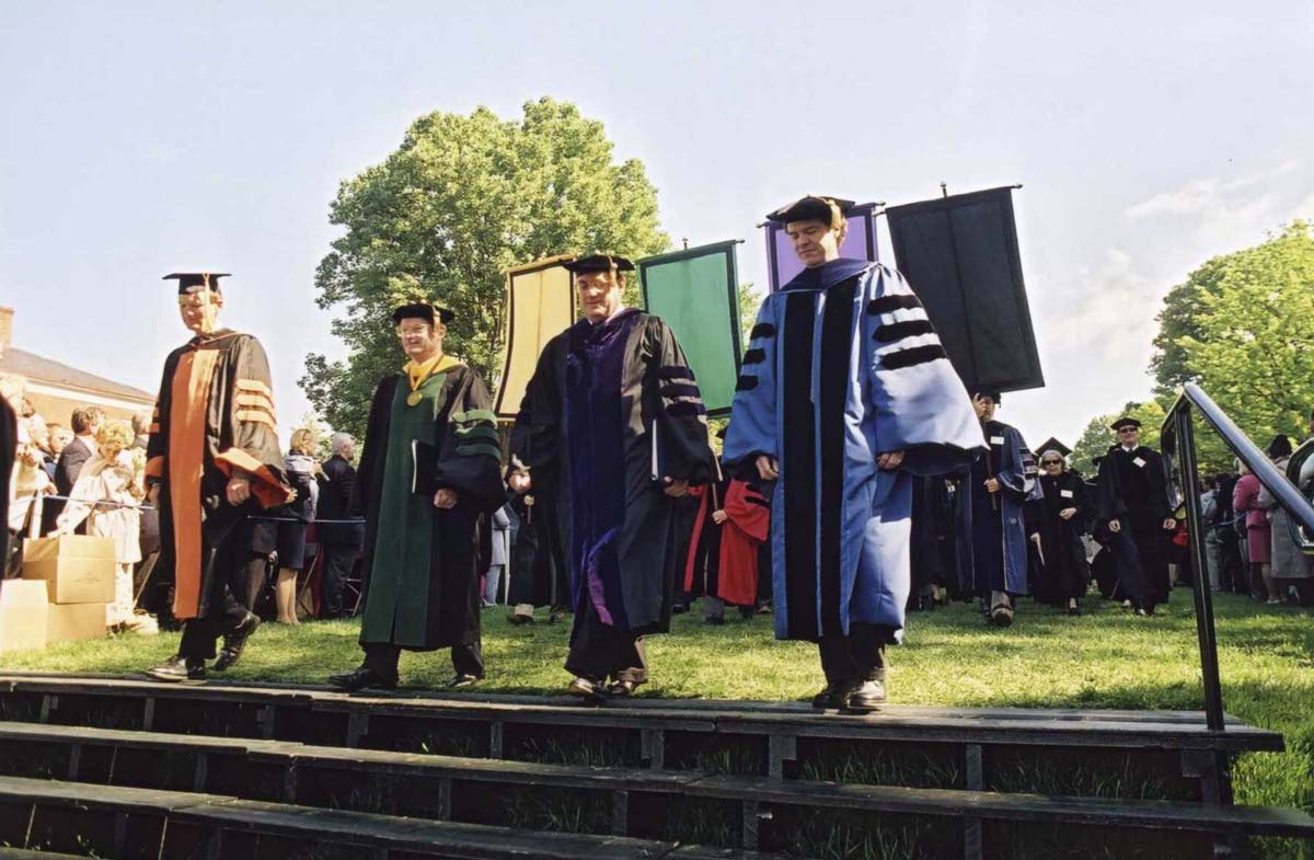 Several deans walk the Lawn, including, starting second from left, Robert M. Carey, dean of the School of Medicine; John C. Jeffries Jr., dean of the School of Law; and Edward Ayers, dean of the College of Arts & Sciences.