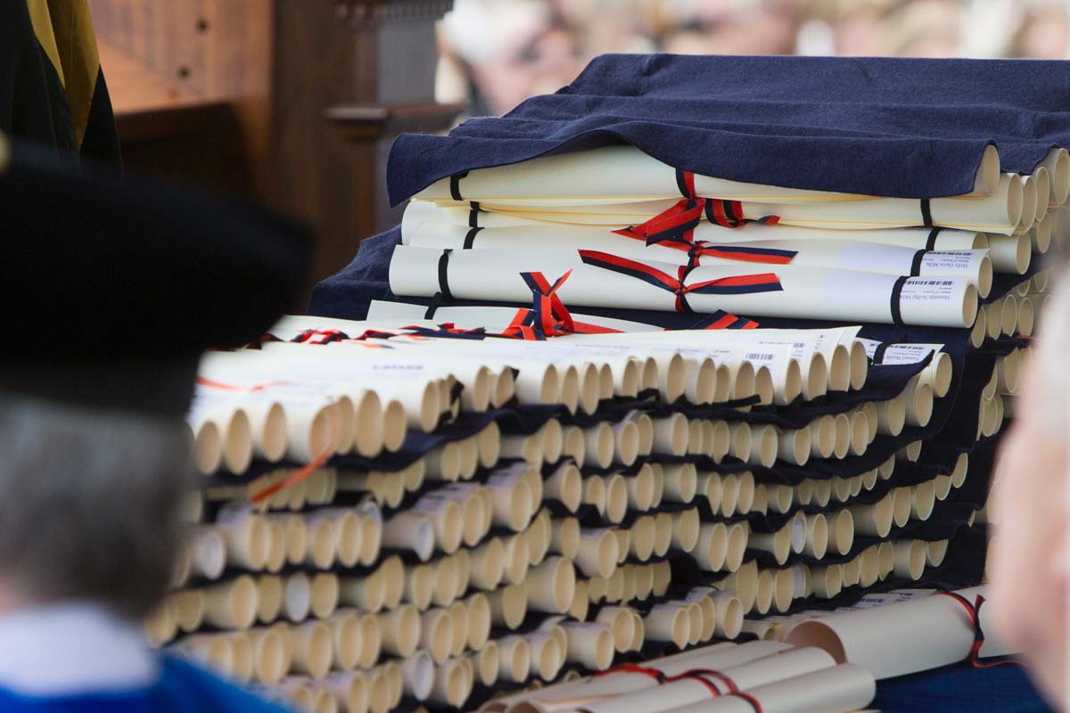 A stack of diplomas prepared by the Office of the University Registrar will be handed out at a departmental graduation ceremony.