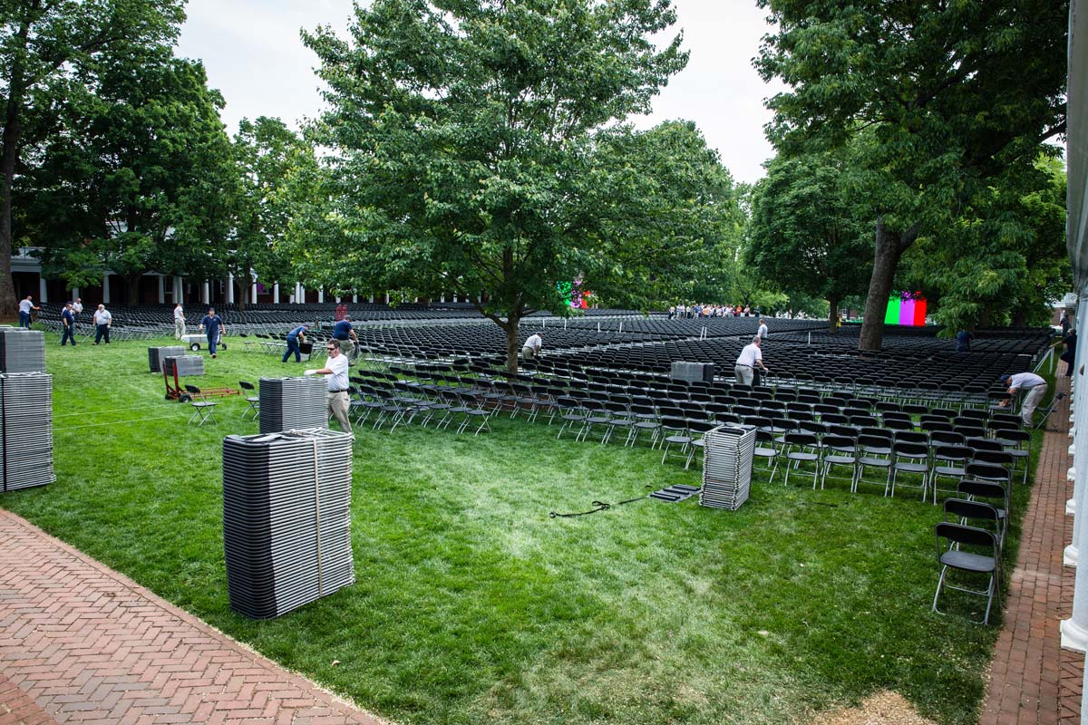 Workers set up chairs for Final Exercises. More than 30,000 people attended the Lawn ceremony in 2013.