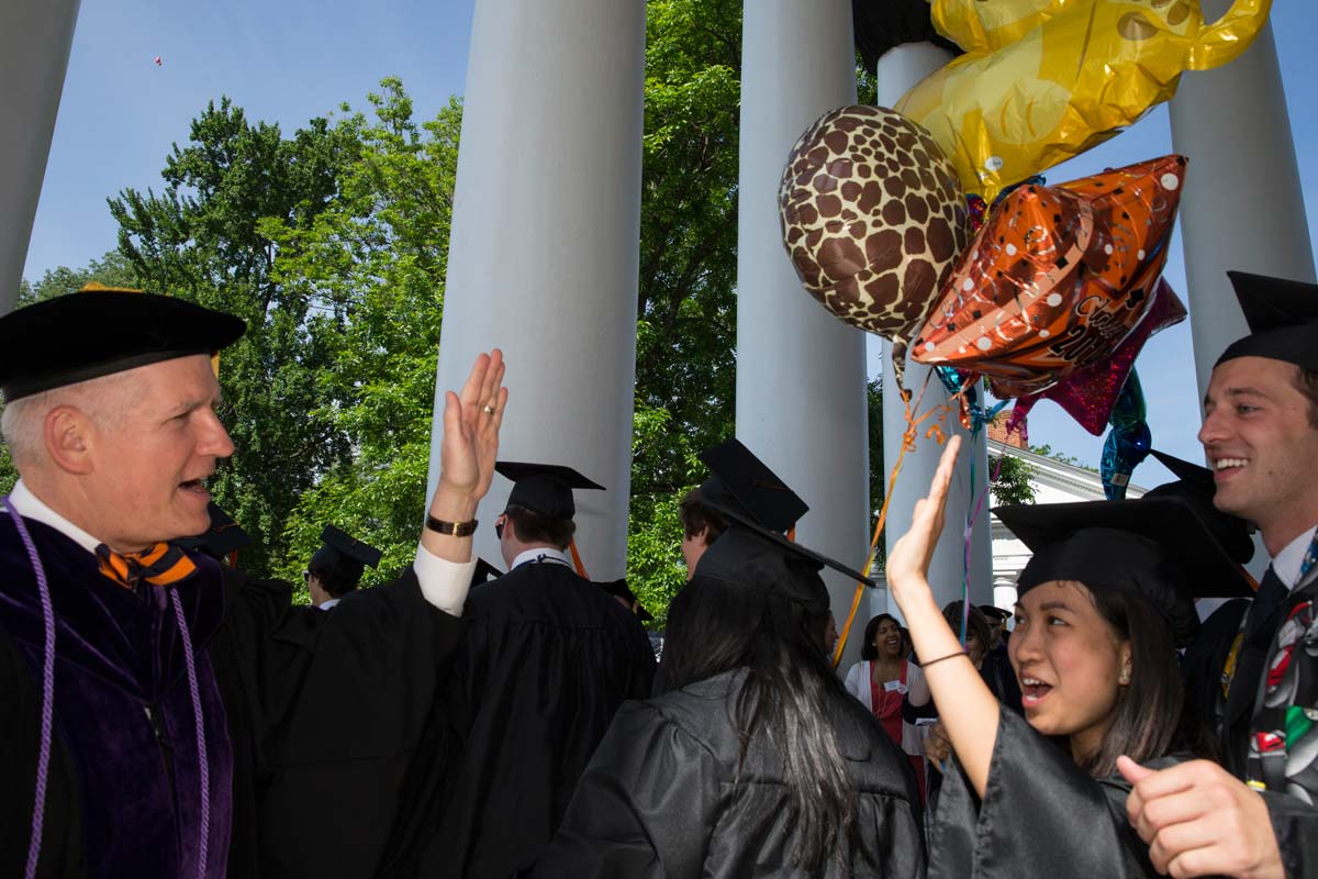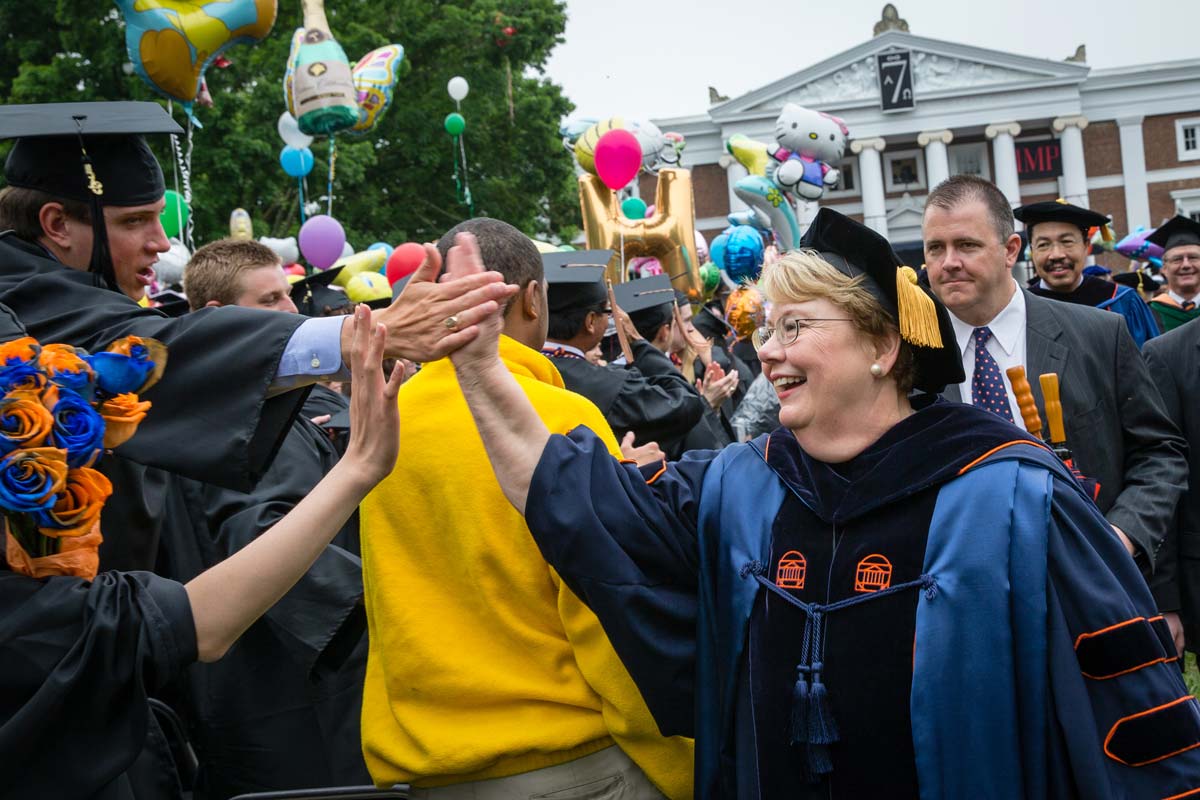President Teresa Sullivan high-fives graduates during Final Exercises. The previous summer she received a groundswell of support from students, faculty and alumni when she was forced to resign and then was reinstated by the Board of Visitors.