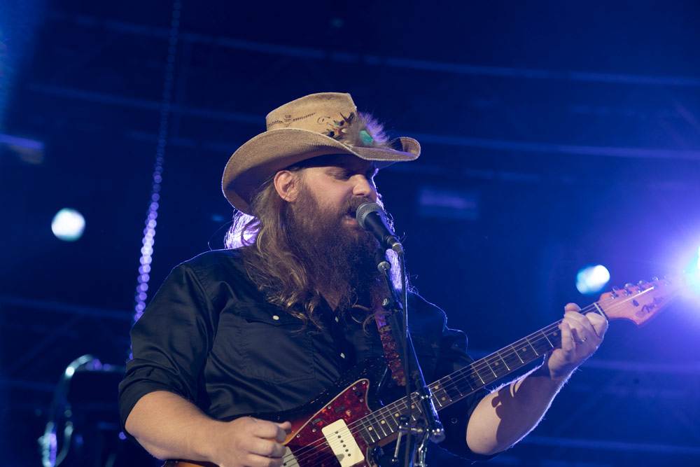 Country and blues crooner Chris Stapleton followed, and the crowd quieted during his five-song performance. As Stapleton strummed the guitar chords of “Broken Halo,” fans waved smartphone flashlights en masse, creating a constellation sky throughout the stadium.
