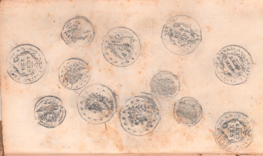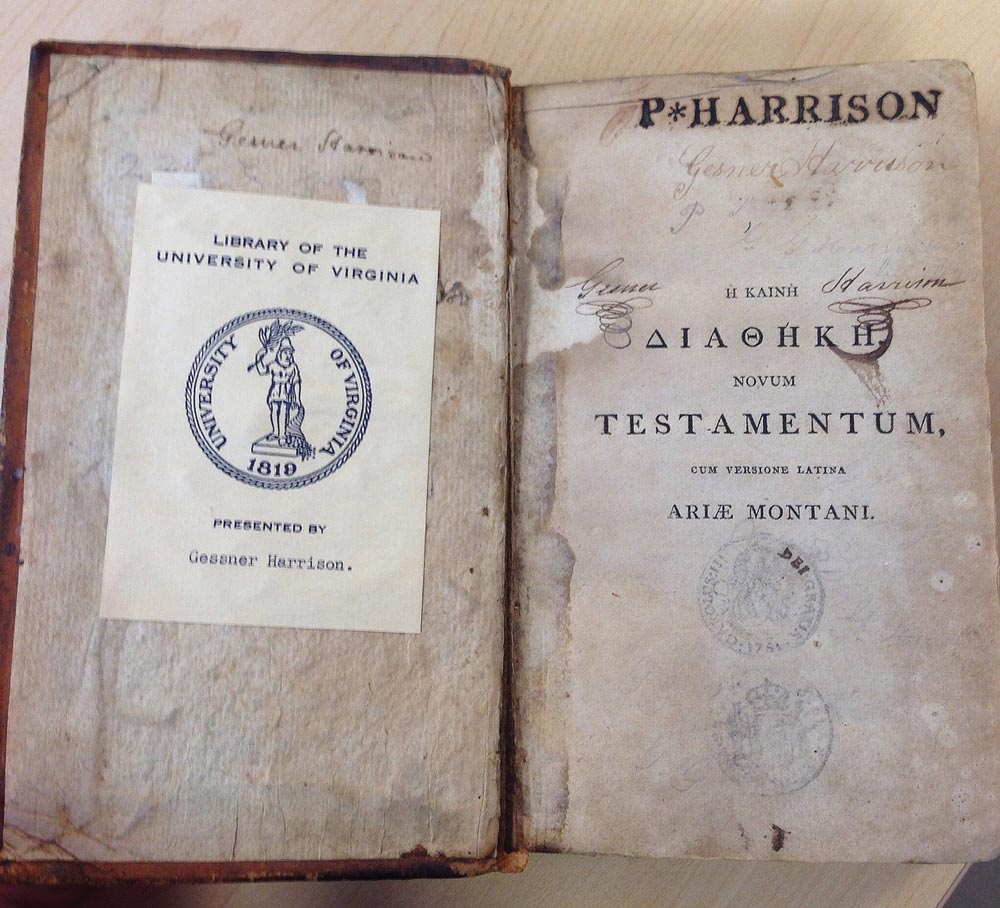 Of the many marginalia examples that Stauffer and his students have discovered, several have local ties to the University. In the example below, Gessner Harrison (1807-62) and his son Peachy Rush Harrison left rubbings of coins dated 1781, pencil notes and other markings inside an 1806 copy of Nova Testamentum. Gessner Harrison was the fifth student to enroll at the University of Virginia and later became a UVA professor of ancient languages.
