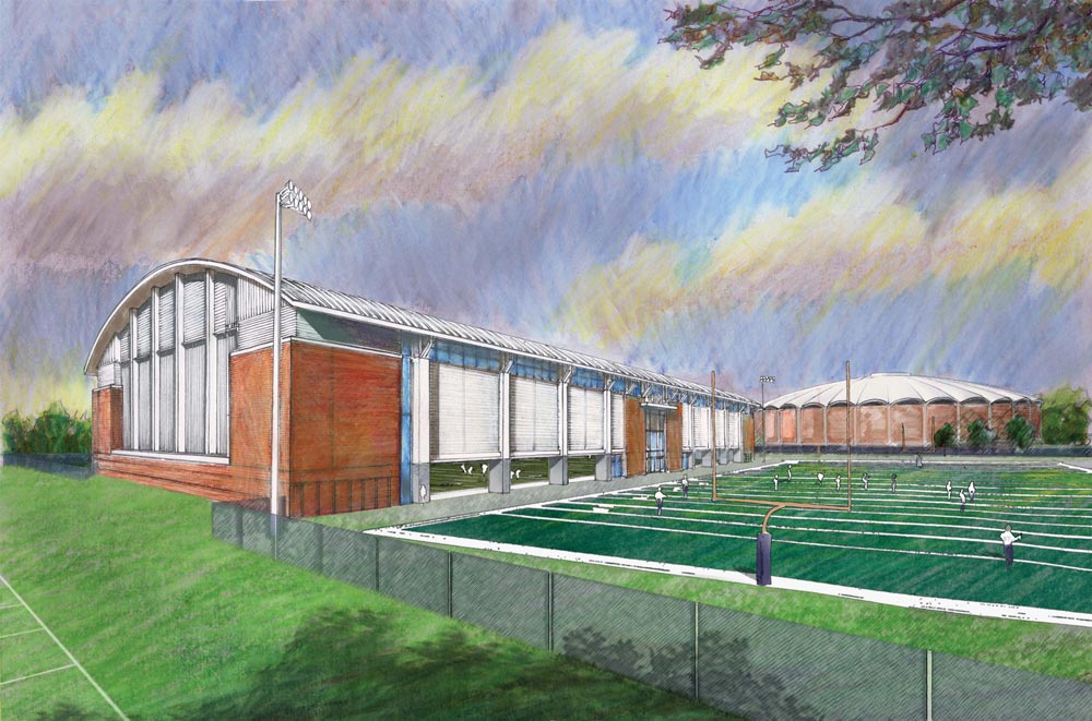 A few discus throws away, just east of University Hall, a 78,000-square-foot, $13 million indoor practice facility, designed primarily for football but available to other varsity sports, will move from drawing board to construction this spring. “This facility is the No. 1 priority in the athletics department right now,” says Littlepage.