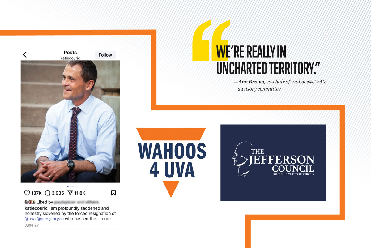 On the other side was an upstart group of alumni and faculty members called Wahoos4UVA. It formed in May to sound the alarm as news stories increasingly hinted that Ryan’s job might be in jeopardy. The group, with an advisory committee led by co-chairs Ann Brown (Col class of ’74, Law class of ’77) and Chris Ford (Engr class of ’87), aimed to “set the record straight” on UVA’s success under Ryan. They asked followers to sign onto a letter in support of the president. In less than a month, thousands were following their lead.
