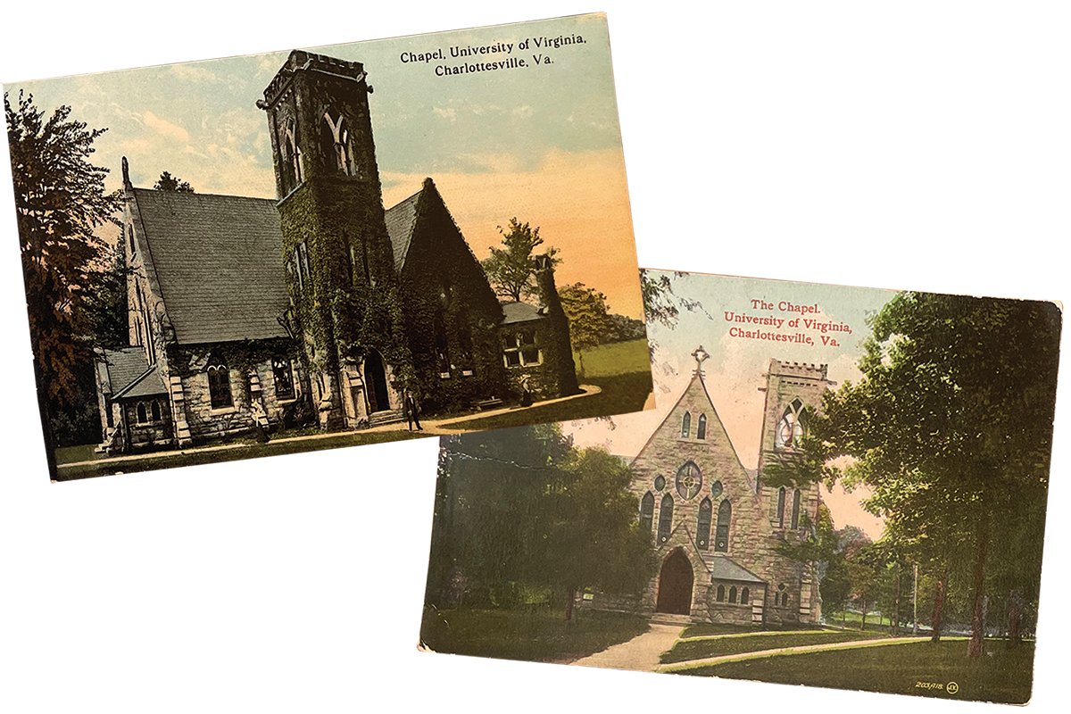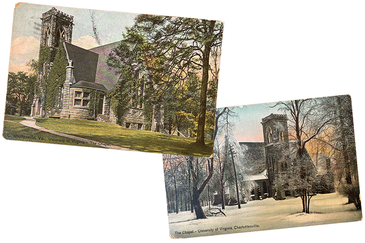 In two of the postcards, the ivy-like vines that covered the building from about 1911 through the 1920s have begun climbing the bell tower. Another shows the Chapel in winter. Though the scene is idyllic, the cold weather took a toll on the structure. The Chapel was just 7 years old when some of the masonry had to be repointed to prevent additional damage from frost. A donor provided $50 to complete the job because the Superintendent of Grounds “did not have so much to expend,” the report notes.