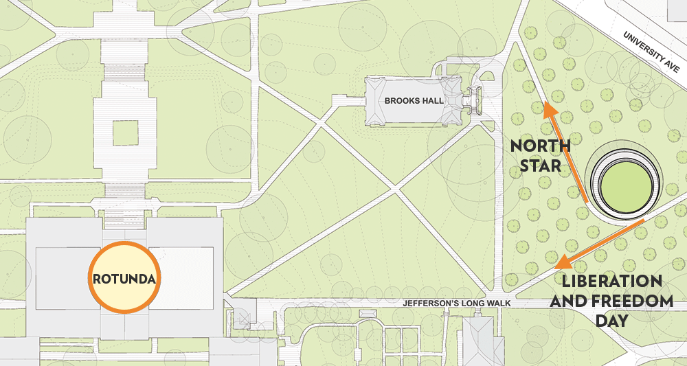 The Freedom Ring will sit at the intersection of two brick walks: One runs below Brooks Hall in the direction of the North Star, the fugitive slaves’ direction of escape, and the direction a visitor will face entering the Freedom Ring. The other will align with the sunset on March 3, the day in 1865 when Union troops freed the local enslaved community—now known as Liberation and Freedom Day.