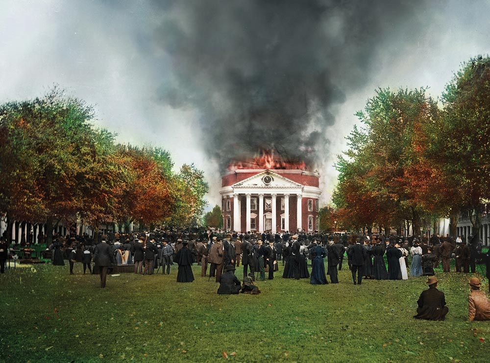 Isaac Kim (Arch class of ’13) colorized the iconic black-and-white photo of the 1895 Rotunda fire from the Holsinger Collection in the Albert and Shirley Small Special Collections Library. “It appears that Holsinger added the flames and smoke during development,” says Kim. “I also added more smoke to approximate the actual amount that was probably there.”