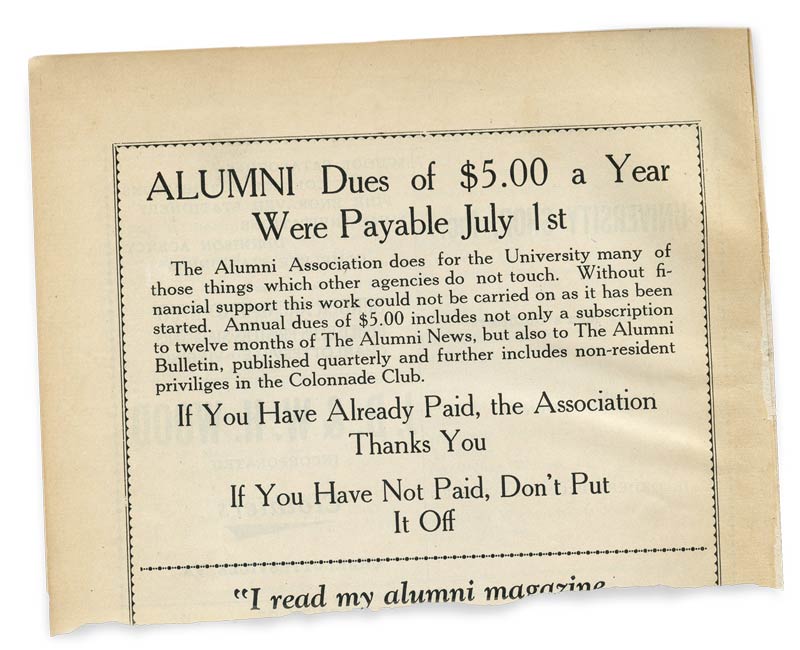 The first life membership of the Alumni Association was offered in 1909 for $5—an alternative to annual dues of 50 cents.