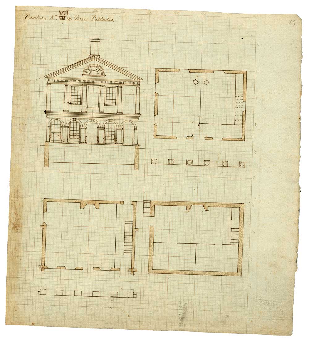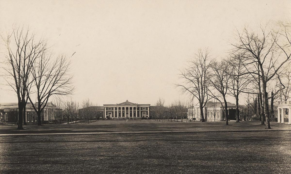 By 1810, Jefferson had already begun to form his ideas for the design of a new university. He envisioned small, connected buildings that would house students and professors surrounding three sides of a lawn to form “an open square of grass & trees.” The result would be “an academical village, instead of a large & common den of noise, of filth, & of fetid air.” Jefferson believed his plan “would afford that quiet retirement so friendly to study, and lessen the dangers of fire, infection & tumult.” He drew the first known site plan for what would become the University in 1814, showing a 257-yard-wide lawn, two-story buildings for professors and rows of one-story dormitories.