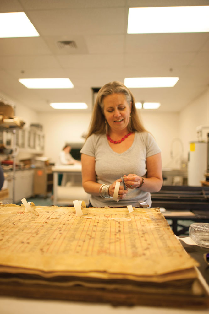 The University’s Albert and Shirley Small Special Collections Library holds more than 16 million objects, a vast trove of materials of incalculable scholarly value. Since she was hired as the first staff conservator in 2009, Gilligan has labored piece by piece to undo the ravages of age and handling and to preserve a range of works, from the minutiae of the diary entries of 19th-century University faculty member Socrates Maupin to a 15th-century choir book more than two feet tall. The goal is to allow these pieces to continue to serve as “usable, movable, durable, functional” resources with stories to tell, she says.