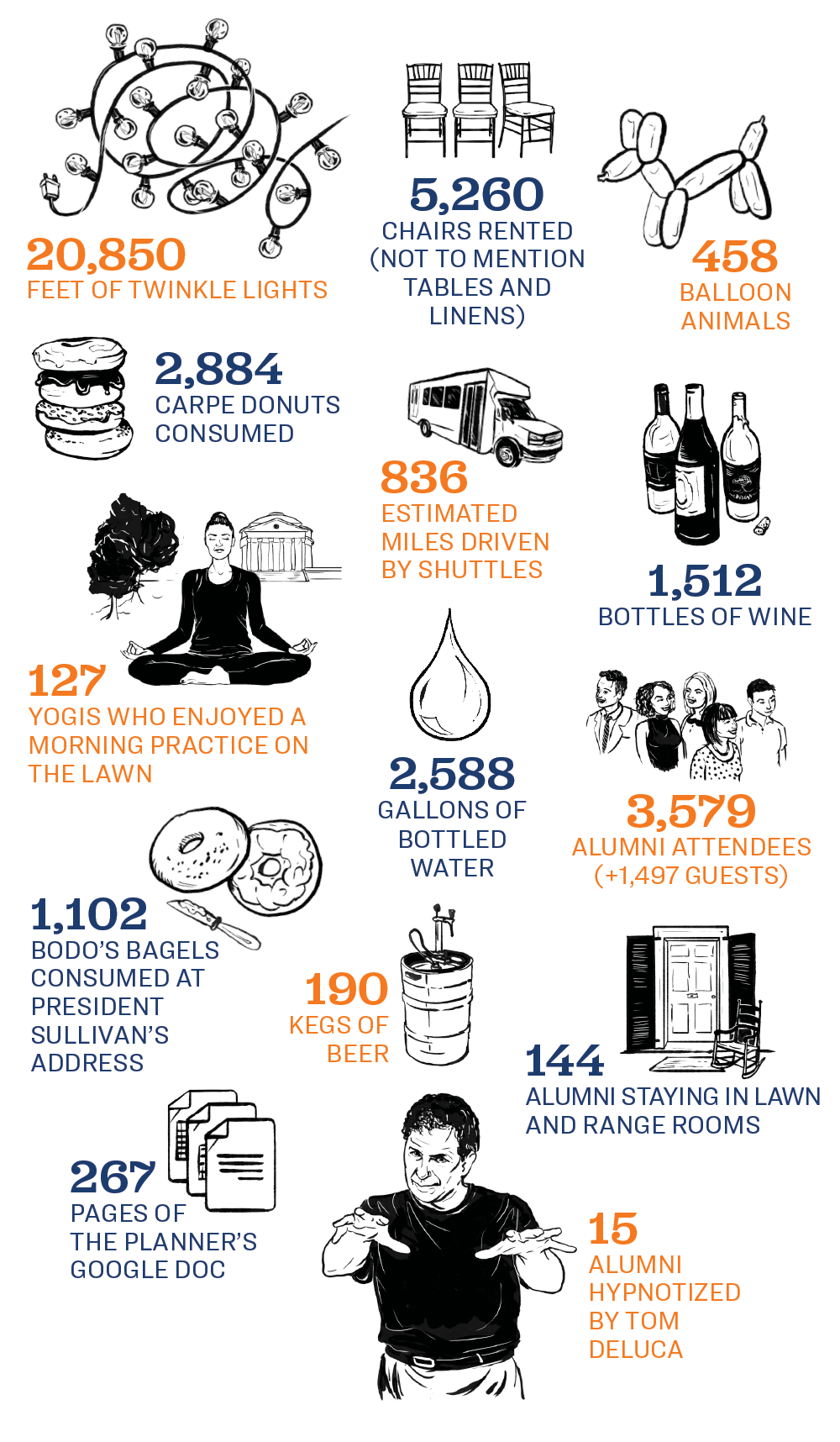 UVA Reunions Weekends succeed on the basic premise of time with friends in a space of shared memories. But what might seem like a simple recipe for success relies on thousands of small details falling into alignment—and then the ability to call an audible when any number of them don’t.