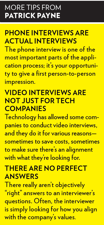 Payne’s interviewing webinar has been one of the most popular presentations of the past year, according to Emily Bardeen (Grad class of ’90), Director of Alumni Career Services and Employer Relations, who echoes his advice to focus on the fundamentals. “It’s really simple,” she says. “Every question in an interview is really asking, ‘Why should I hire you?’ So every answer you give needs to end, implicitly, with, ‘So that’s why you should hire me.’ You should always have three reasons in your head to answer that question, so that you know what to say at any time.”