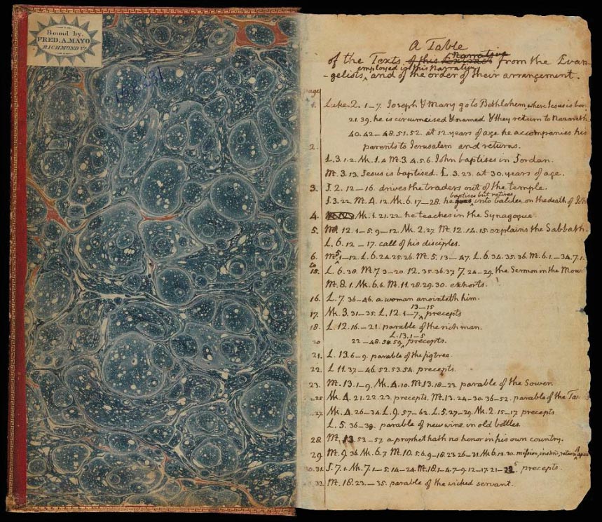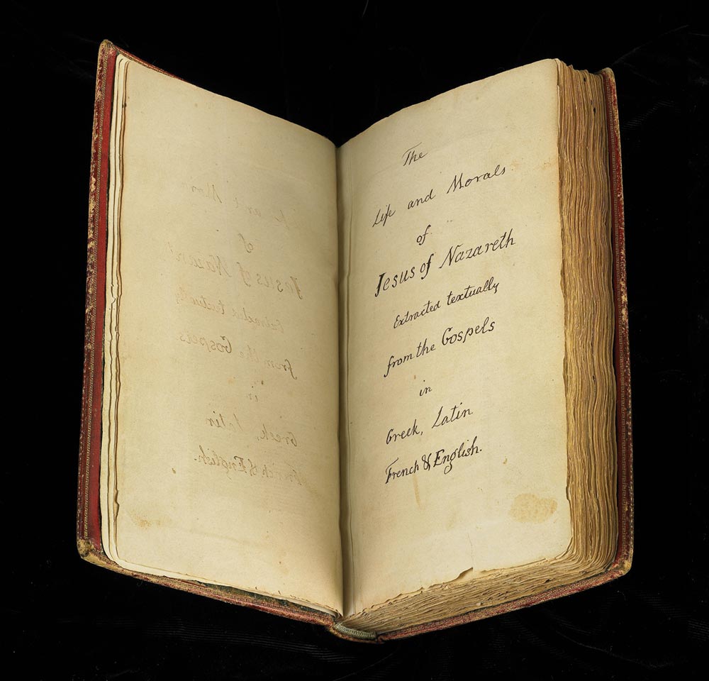 In 1804, during his first term as president, he made a stab at cutting and pasting passages of the New Testament to reflect “The Philosophy of Jesus,” as he called it. Other affairs took precedent, however, until 1819, when, with exacting precision and characteristic ingenuity, he compiled “The Life and Morals of Jesus of Nazareth Extracted Textually from the Gospels in Greek, Latin, French & English.”