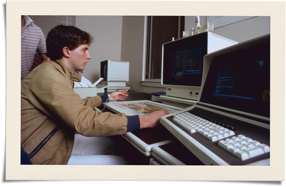Katherine Mitchell (Engr class of ’86) remembers the Stacks Computing Facility opening during her third year. She and her classmates steered clear of the lab, she says, thinking it was overcrowded by first-years; instead they used the mainframe terminals scattered throughout the Engineering School. “We all thought, ‘That won’t last. Personal computers are a fad that will come and go.’ Ha! I guess we missed that ship.”
