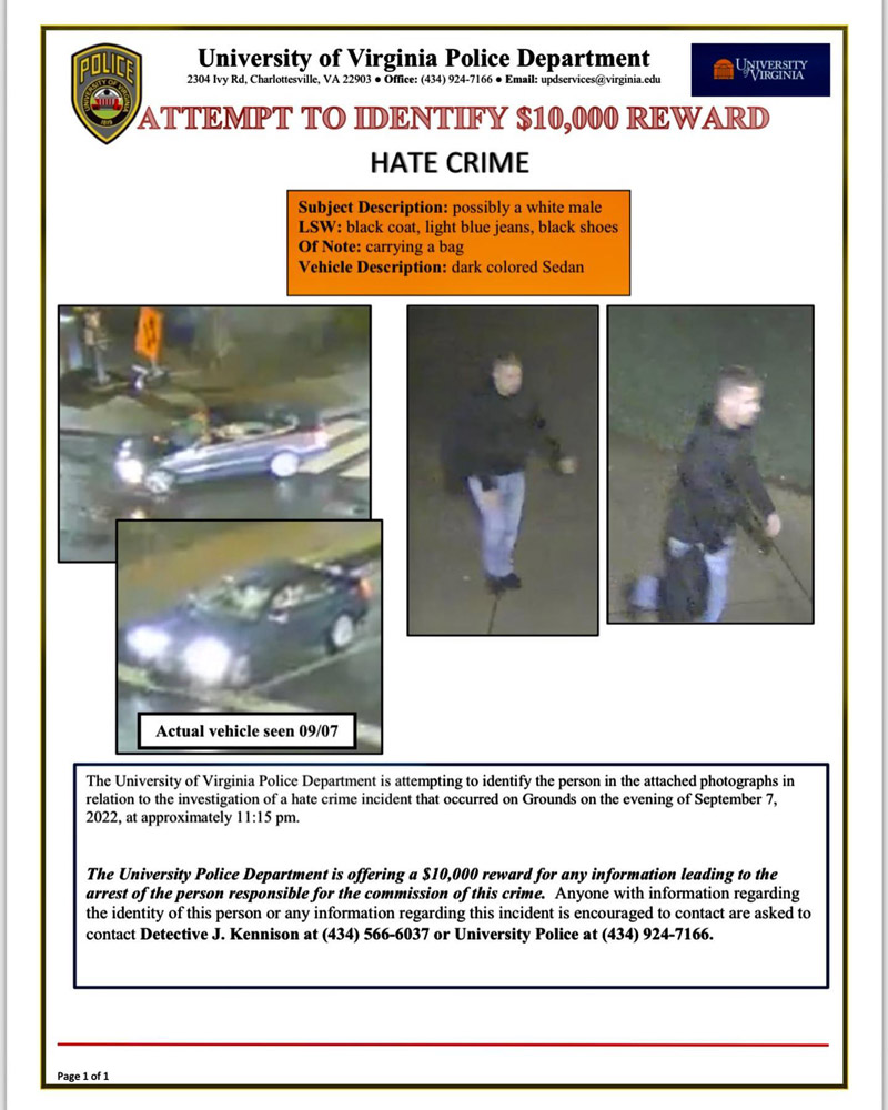 Virginia law makes displaying a noose in a public place with the intent to intimidate a felony, carrying a potential one- to five-year prison sentence. University Police Department officials have not publicly identified a suspect but have released security footage images of a man and a dark sedan. An anonymous donor enhanced UPD’s original $2,000 reward to $10,000 for information leading to an arrest.