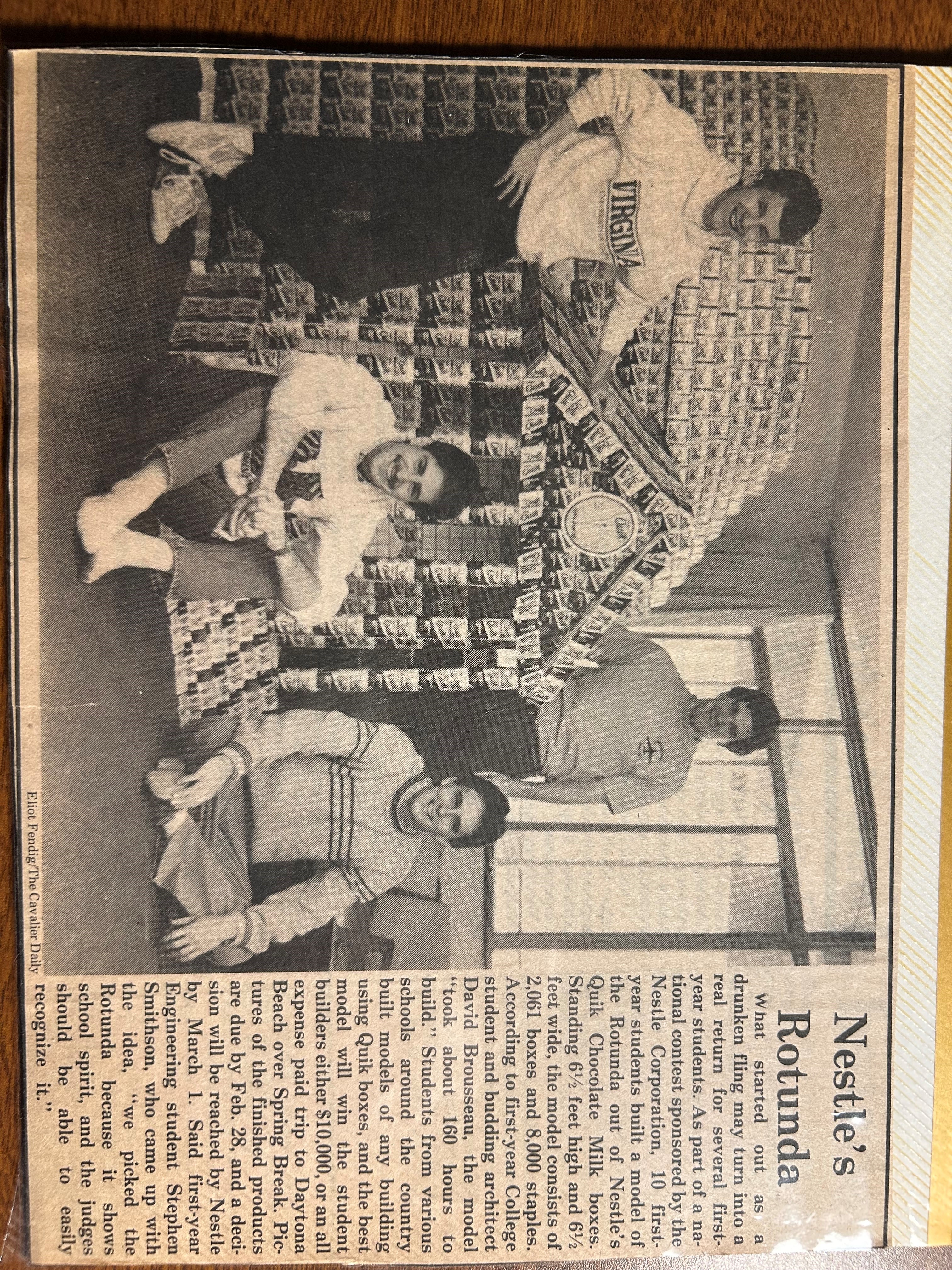 I enjoyed your article describing various models of the Rotunda that recent students have created. Their renderings in Minecraft, Lego and The Sims were all truly impressive. But students have been doing low-tech projects along these lines for many years. Back in 1986, our first-year suite (Watson 140s) created a replica Rotunda from over 2,000 Nesquik chocolate milk boxes. Most of us were neither engineering nor architecture students; we just saw an opportunity for some fun and jumped on it. While we didn’t win the Nestlé competition (the winning team constructed a replica Mayflower that actually floated!), we placed third nationally, winning Swatch watches for our team. The architecture at UVA is an integral part of what makes this place so special, and Rotunda-inspired building projects will never go out of style.