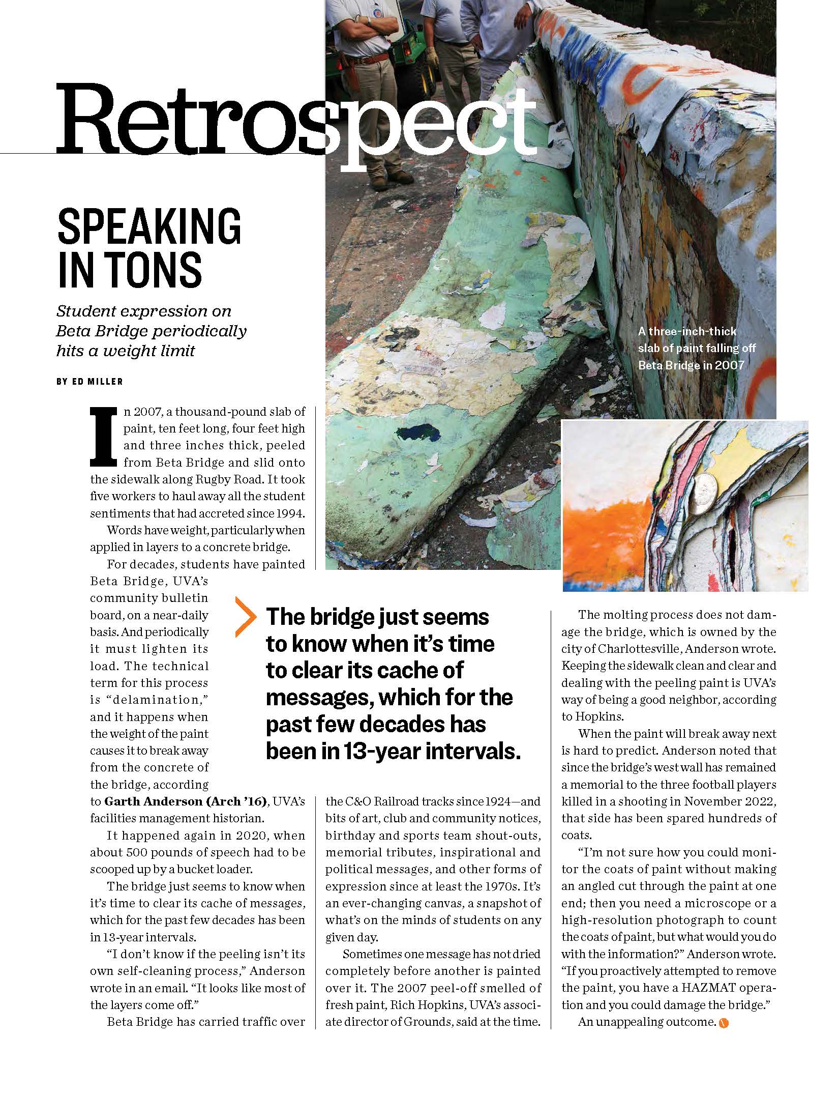 I believe the painting of Beta Bridge started in 1967. When I entered the university in 1965, the only adornment was scores from past football games. Then, right before St. Patrick’s Day of my second year, someone applied a coat of green paint and scrawled “Erin Go Bragh” on one side of the bridge. A month later a group painted it red and inscribed “God Save the Queen,” along with an obscenity. Both incidents were viewed as acts of vandalism, and the latter, which was reported in the April 17, 1967, Daily Progress, led to the arrest of 10 students. Two of them were sentenced to 30 days in jail, and a third was fined $25 for “cussing in public.”