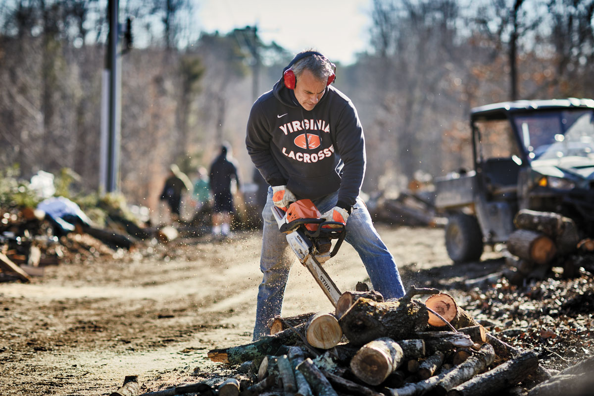 Lars Tiffany, UVA’s men’s lacrosse coach who led the team to the national championship in 2019, spent a lot of time chopping wood in 2020. Missing daily connections with his players, Tiffany found joy while cutting trees and splitting firewood at his own home and for neighbors and friends. Soon, he got involved in Start a Spark, a Virginia nonprofit that gets firewood to those in need.