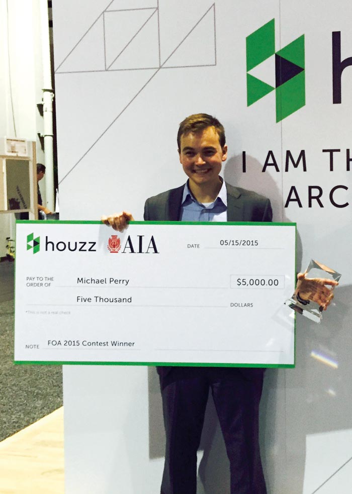 In May, Perry’s entry took first place in the social impact category of the Future of Architecture Residential Design Contest and Showcase. The contest, open to students and professionals, was sponsored by the American Institute of Architects and Houzz, an online home-design platform. A website featured entries for more than a month, and popular vote determined the winners.
