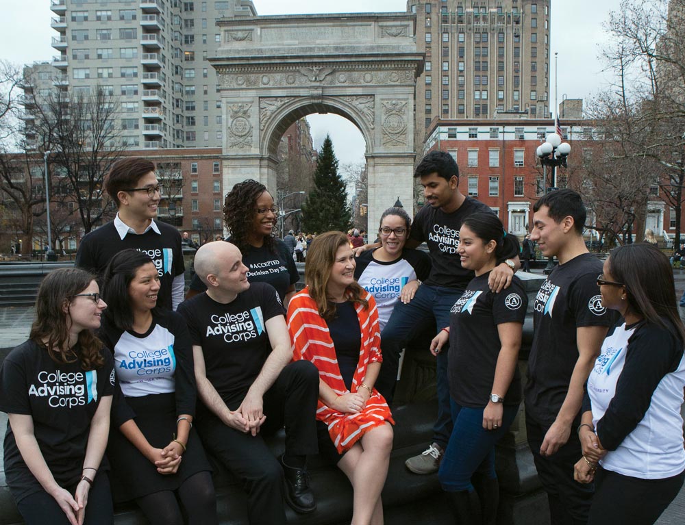 Corps advisers overwhelmingly come from backgrounds similar to those of the students they are trying to reach. In 2015-16, 54 percent were first-generation college students, and two-thirds are people of color. “I always love when I say to a potential recruit, ‘Why do you want to do this work?’” says Hurd, “and they say, ‘Because there was somebody on my left in high school and somebody on my right, and they should’ve been here too, but they weren’t.’”