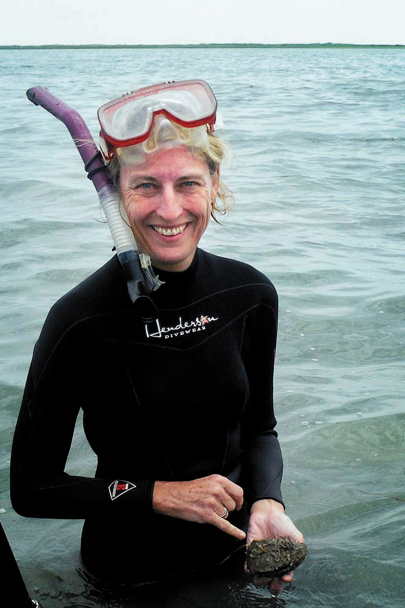 Professor Karen McGlathery shows a sea scallop at a research site on Virginia’s Eastern Shore. The bivalves are returning with the seagrasses.