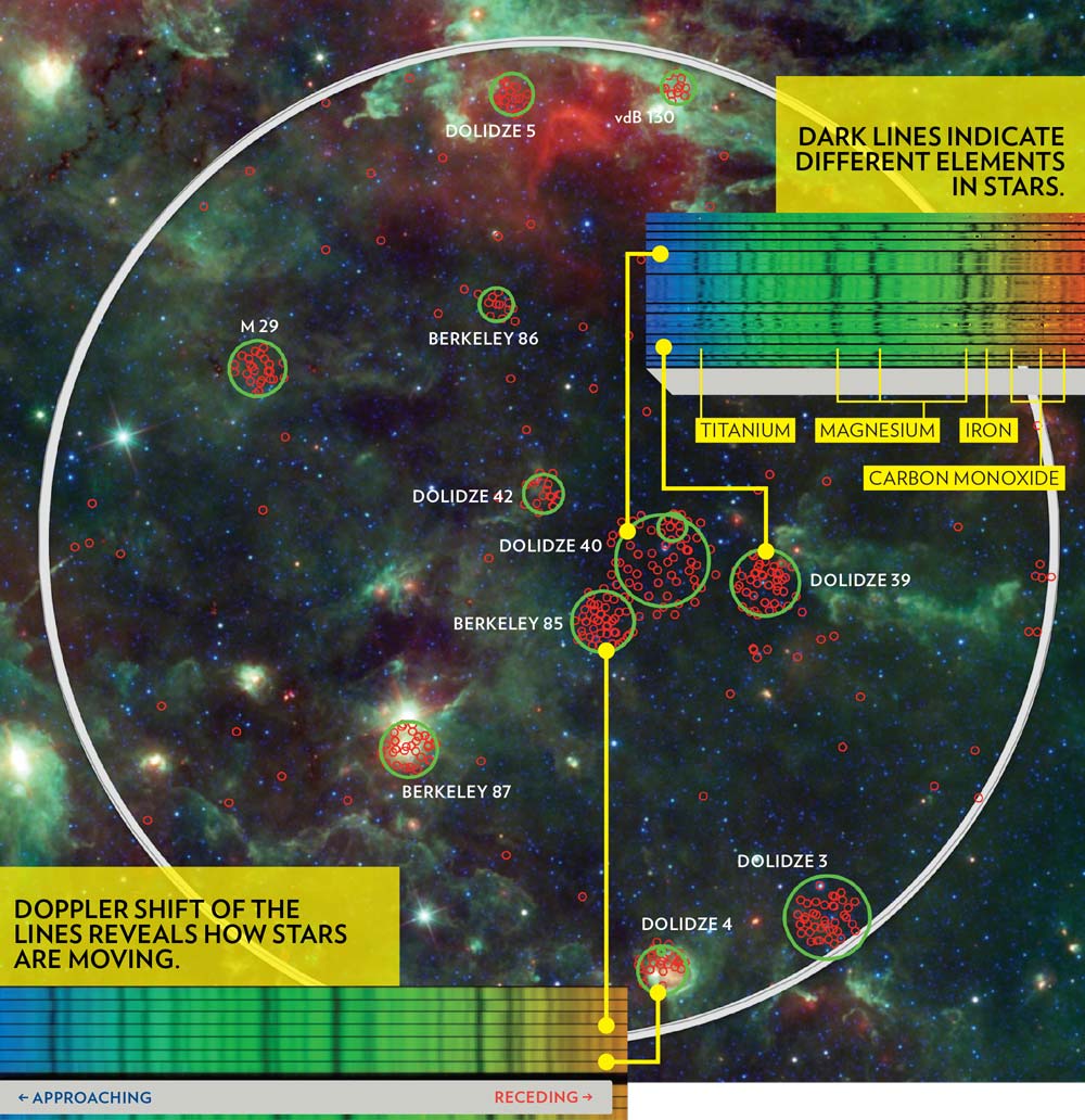 APOGEE reveals chemical compositions by making detailed infrared rainbows of each star’s light that show telltale patterns of lines corresponding to individual elements like oxygen, carbon and nitrogen. The precise positions of these lines also reveal the Doppler shift of each star, allowing scientists to determine which way the stars are moving in the galaxy—another factor that sheds light on their age and origin.