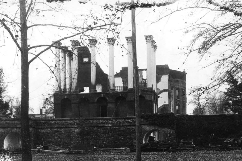 Oct. 27, 1895 Rotunda burns to a shell. Fire begins in the annex and spreads to the Rotunda despite Professor William Echols dynamiting the connecting portico. Students save portraits, thousands of books from the library and Alexander Galt’s statue of Jefferson.Albert and Shirley Small Special Collections Library - 1896–1898