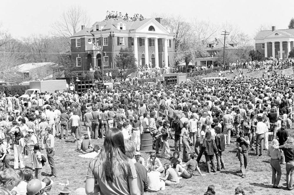May 4–9, 1970 “May Days” protests against the Vietnam War disrupt the University. Many UVA students join the national student strike and thousands demonstrate after four Kent State student protesters are killed by National Guard troops in Ohio. Shannon refuses to cancel classes but wins student support with a dramatic speech opposing the war to a crowd of 4,000 on the Lawn.Arthur J. Morris Law Library Special Collections - September 1970